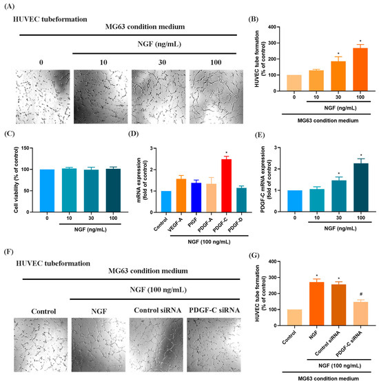 NGF promotes angiogenesis in MG63 cells through PDGF-C expression. (A,B) HUVEC tube formation assays showing the growth of capillary-like structures following 6-h incubation in conditioned medium collected from MG63 cells treated with NGF at various concentrations (0–100 ng/mL) for 24 h. Images were captured at 4× magnification. (C) MG63 cells were treated with different concentrations of NGF (10, 30, 100 ng/mL) for 24 h, and cell viability was measured using the MTT assay. (D) MG63 cells were incubated with NGF for 24 h before determining 5 potential angiogenesis candidates by qPCR. (E) MG63 cells were incubated with varying concentrations of NGF (30, 50, or 100 ng/mL) for 24 h, and the levels of PDGF-C expression were examined by qPCR assays. (F,G) HUVEC tube formation assays showing the growth of capillary-like structures following 6-h incubation in conditioned medium collected after MG63 cells were transfected with PDGF-C siRNAs for 24 h, then stimulated with NGF for an additional 24 h. Images were captured at 4× magnification. All experiments were repeated at least three times. * p < 0.05 compared with the control group; # p < 0.05 compared with the NGF-treated group.