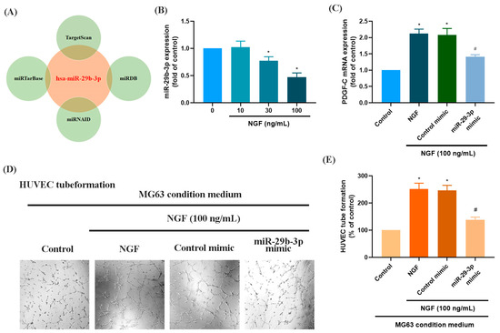 NGF increases PDGF-C expression and HUVEC tube formation in MG63 cells by downregulating miR-29b-3p. (A) An analysis of four miRNA prediction databases identified miR-29b-3p as a candidate binding to the 3′-UTR of PDGF-C. (B) MG63 cells were treated with different concentrations of NGF (30, 50, 100 ng/mL) for 24 h, and miRNA expression levels were examined by qPCR. (C–E) MG63 cells were transfected with miR-29b-3p mimic or control mimic for 24 h, then stimulated with NGF for another 24 h. PDGF-C expression levels and angiogenesis were evaluated using qPCR and HUVEC tube formation assays. Images were captured at 4× magnification. All experiments were repeated at least three times. * p < 0.05 compared with the control group; # p < 0.05 compared with the NGF-treated group.