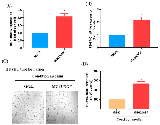 Overexpression of NGF promotes angiogenesis in MG63 cells. (A,B) MG63 cells were transfected with an empty vector or an NGF-overexpressing vector (MG63/NGF). NGF and PDGF-C mRNA expression levels were detected by qPCR. (C,D) HUVEC tube formation assays showing the growth of capillary-like structures following 6-h incubation in conditioned medium collected from MG63 and MG63/NGF cells. Images were captured at 4× magnification. All experiments were repeated at least three times. * p < 0.05 compared with the MG63 group.