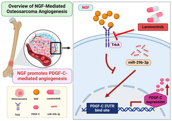 The nerve growth factor (NGF) and its receptor, tropomyosin receptor kinase A (TrkA), play critical roles in tumor progression, including angiogenesis, metastasis, and cancer-induced bone pain [22]. TrkA, a high-affinity receptor for NGF, regulates various downstream signaling pathways, such as RAS/MAPK, PI3K/AKT, and PLCγ, which promote cell proliferation, differentiation, survival, and tumor vascularization [23,24]. NGF is highly expressed in the tumor microenvironment and facilitates cancer progression by promoting the growth of sensory and sympathetic nerves [25]. The NGF/TrkA axis has been implicated in the progression and metastasis of multiple cancers, including breast, lung, colon, pancreatic, and prostate cancers [24,25]. In OS, NGF-TrkA signaling is suspected to enhance angiogenesis by influencing endothelial and tumor cells, although the molecular mechanisms remain unclear. Larotrectinib, a highly selective inhibitor of the TRK family, including TrkA, has shown promising efficacy in TRK fusion-positive cancers [5,26]. Its potential to inhibit NGF/TrkA-mediated angiogenesis in OS offers a novel therapeutic strategy. The aim of this study is to investigate the role of the NGF-TrkA axis in OS angiogenesis and to elucidate the molecular mechanisms driving this process, focusing on its interaction with platelet-derived growth factor C (PDGF-C) and miR-29b-3p. Understanding these pathways could provide a basis for developing novel therapeutic strategies targeting NGF-mediated angiogenesis in OS. By targeting this pathway, larotrectinib may suppress tumor-induced angiogenesis and metastasis, providing a new avenue for OS treatment. Further research into NGF/TrkA signaling and the effects of larotrectinib could advance therapeutic options for this aggressive cancer.