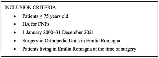 The study cohort included all patients aged 75 years and older who underwent HA for FNFs between 1 January 2000, and 31 December 2021. No restrictions were applied with respect to fracture classification. No exclusion criteria were applied concerning the ASA score, the functional status, the living situation, and the pre-fracture function of the patient. As already mentioned, patients not living in Emilia Romagna were excluded to minimize the risk of incomplete follow-up (Figure 1).