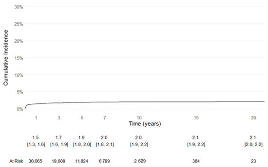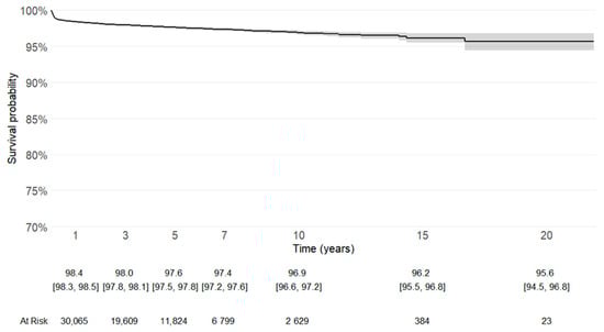 Kaplan–Meier survivorship analysis, with revision for any cause or removal of the prosthetic material as the endpoint, confirmed satisfactory long-term implant survival (Figure 2).
