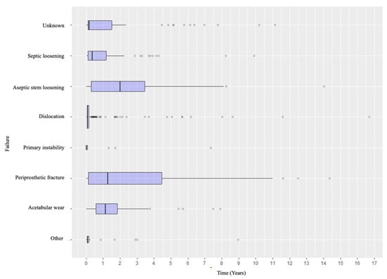 The distribution of failure mechanisms according to the time from the index surgery in this series supplies relevant clinical insights. Dislocations tended to be clustered in the early postoperative period, emphasizing the need for surgical stability, approach selection, and soft-tissue management [,,,,,,]. Conversely, aseptic loosening and acetabular erosion appeared later, reflecting both biological and mechanical processes that evolve over time rather than issues involving the index procedure [,]. Periprosthetic fractures, as already mentioned, tend to occur all throughout.