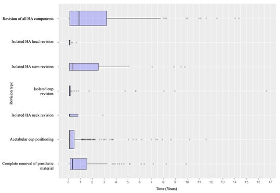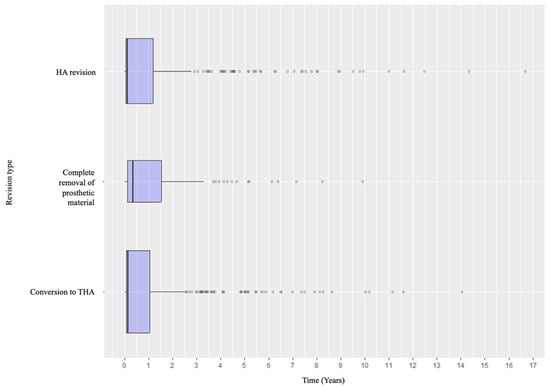 Concerning revisions, three big groups, such as the conversion to THA, the sole revision of HA, or the removal of the prosthetic materials, were firstly described. Then they were analyzed as subtypes in detail.