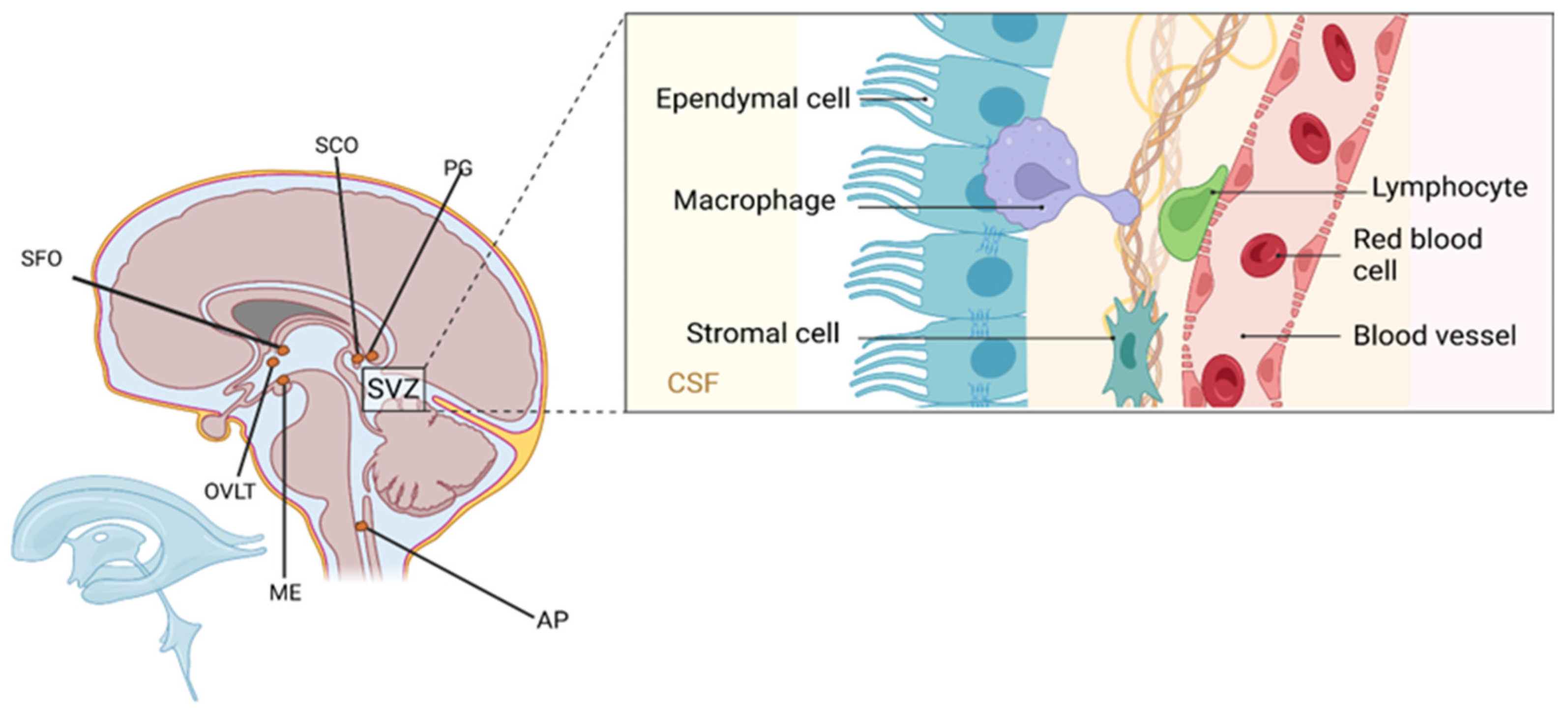 - Yao, Y.; Chen, Y.; Tomer, R.; Silver, R. Capillary connections between sensory circumventricular organs and adjacent parenchyma enable local volume transmission. J. Neuroendocrinol. 2025, 37, e13490. [Google Scholar] [CrossRef] [PubMed]
