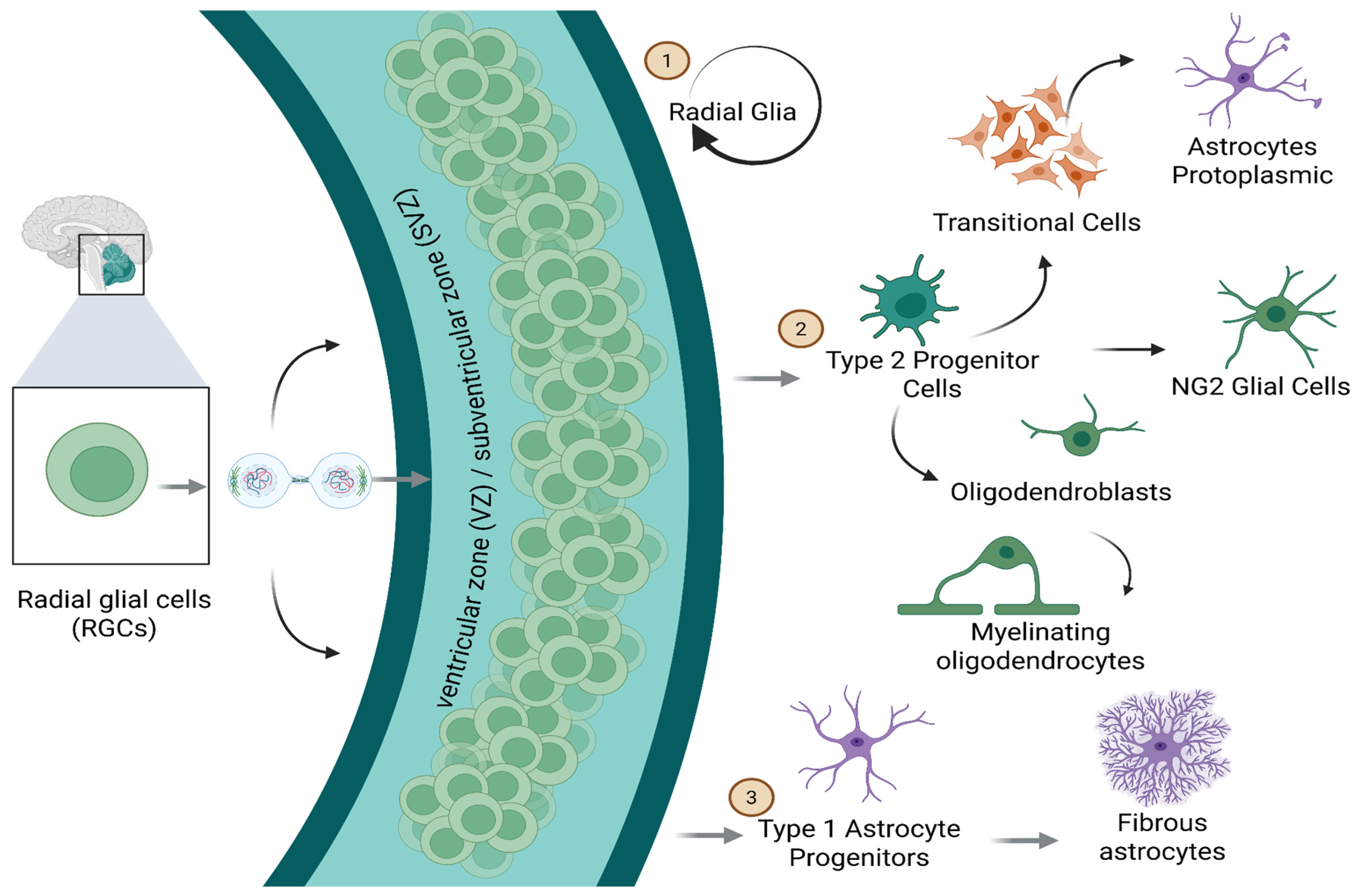 - Fu, Y.; Yang, M.; Yu, H.; Wang, Y.; Wu, X.; Yong, J.; Mao, Y.; Cui, Y.; Fan, X.; Wen, L.; et al. Heterogeneity of glial progenitor cells during the neurogenesis-to-gliogenesis switch in the developing human cerebral cortex. Cell Rep. 2021, 34, 108788. [Google Scholar] [CrossRef]