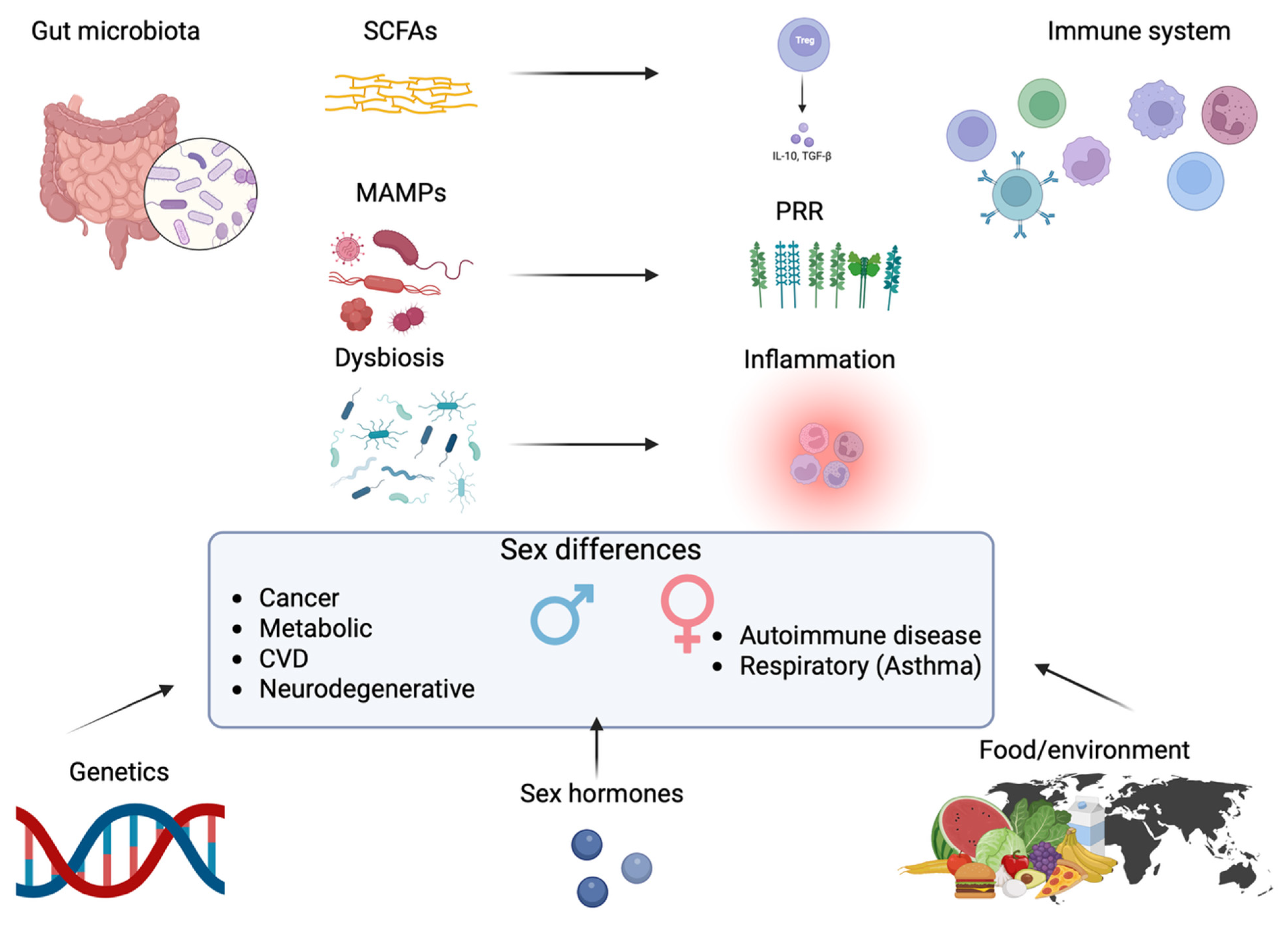 GM communicates with the immune system mainly through metabolites (e.g., SCFAs) and microbial signals (MAMPs recognized by PRRs). Dysbiosis promotes chronic inflammation, and sex differences influence how these pathways affect disease susceptibility. Microbial fermentation of dietary fibers yields short-chain fatty acids (SCFAs), primarily acetate, propionate, and butyrate. These SCFAs, in turn, modulate host physiology by strengthening the intestinal epithelial barrier, stimulating regulatory T-cell responses, and downregulating the production of pro-inflammatory cytokines.