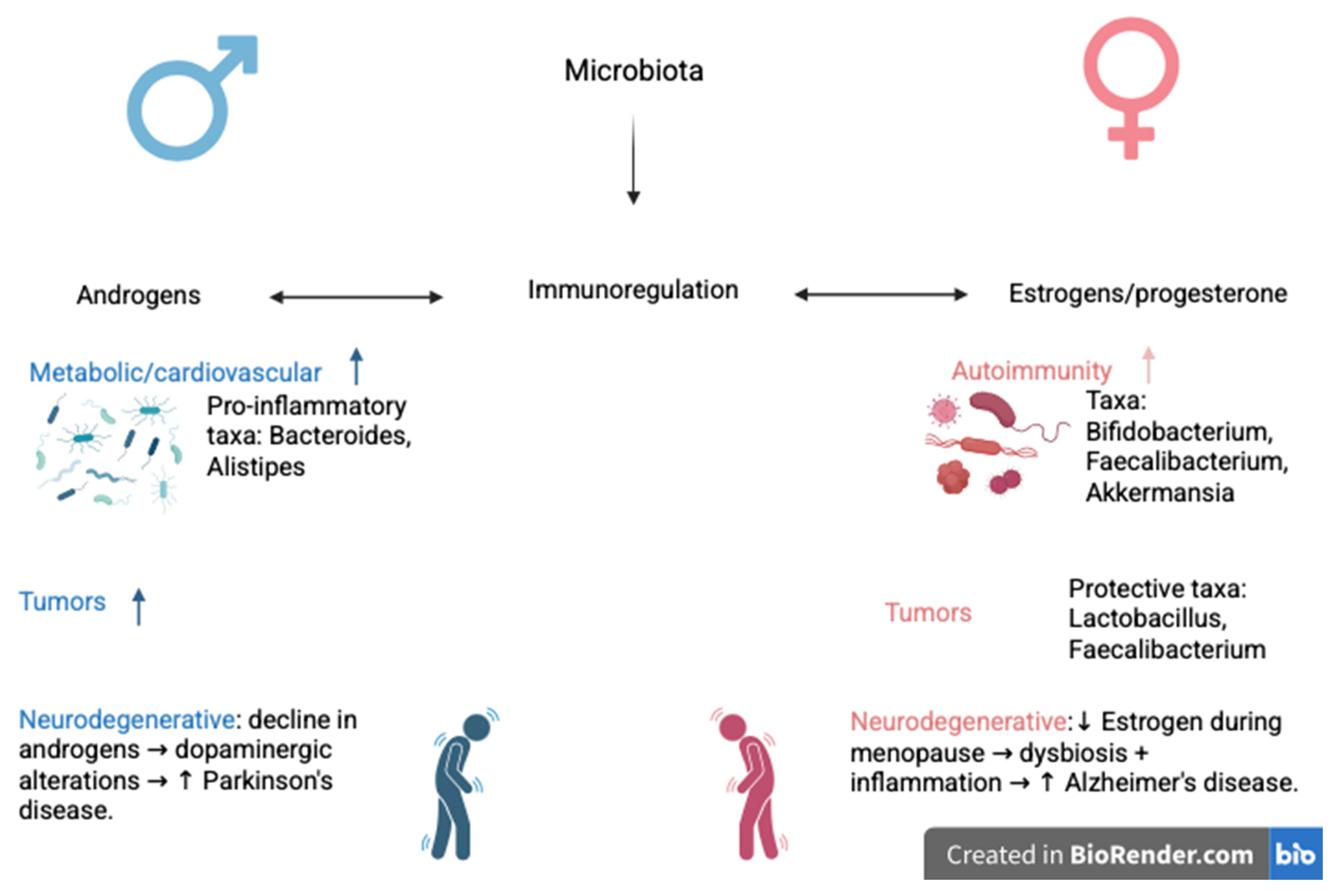 Figure 2. Sex-specific pathways through which microbiota composition and sex hormones (androgens in males, and estrogens/progesterone in females) influence immune regulation and disease susceptibility. For example, in males, the Bacteroides and Alistipes bacteria in the microbiota are associated with pro-inflammatory states, metabolic and cardiovascular effects, and an increased risk of Parkinson’s disease. For females, the estrogen/progesterone-associated microbiota, such as those found in Bifidobacterium, Faecalibacterium, and Akkermansia, are associated with autoimmunity, protective effects against tumors, and an increased risk of Alzheimer’s disease related to dysbiosis and inflammation after menopause. ↑ stands for “increase”; ↓ stands for “decrease”. Created with BioRender.com (https://app.biorender.com/illustrations/68ce5e5a0412ec45e879447e?slideId=d03490df-dcdc-4e6e-9b08-93c7e2adca2c, accessed on 20 September 2025).