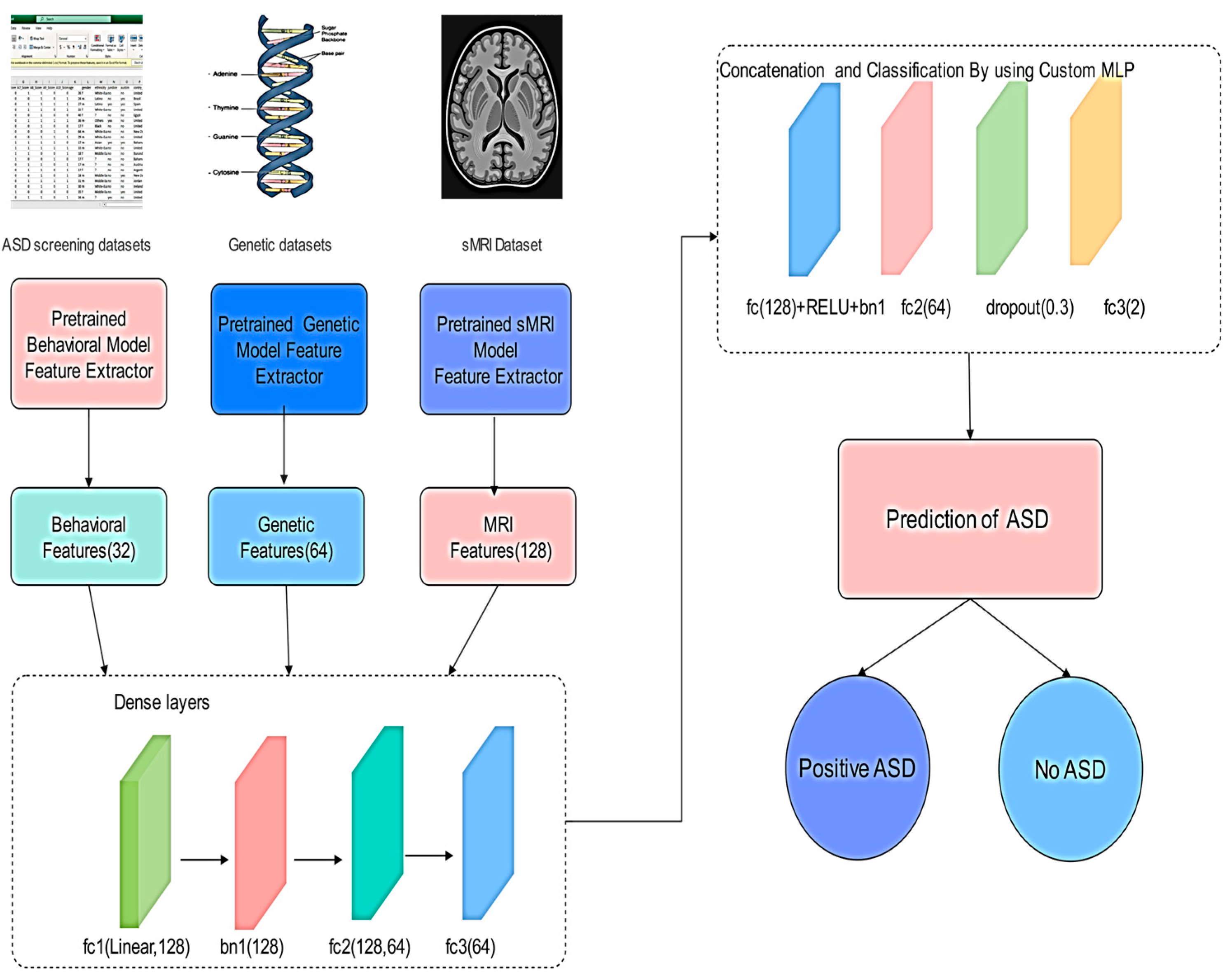 The proposed Multimodal framework is a fusion strategy that integrates to improve diagnostic accuracy, behavioral, genetic, and structural MRI (sMRI) data from fusion-based techniques have been shown to outrank single-modal models in related medical imaging.