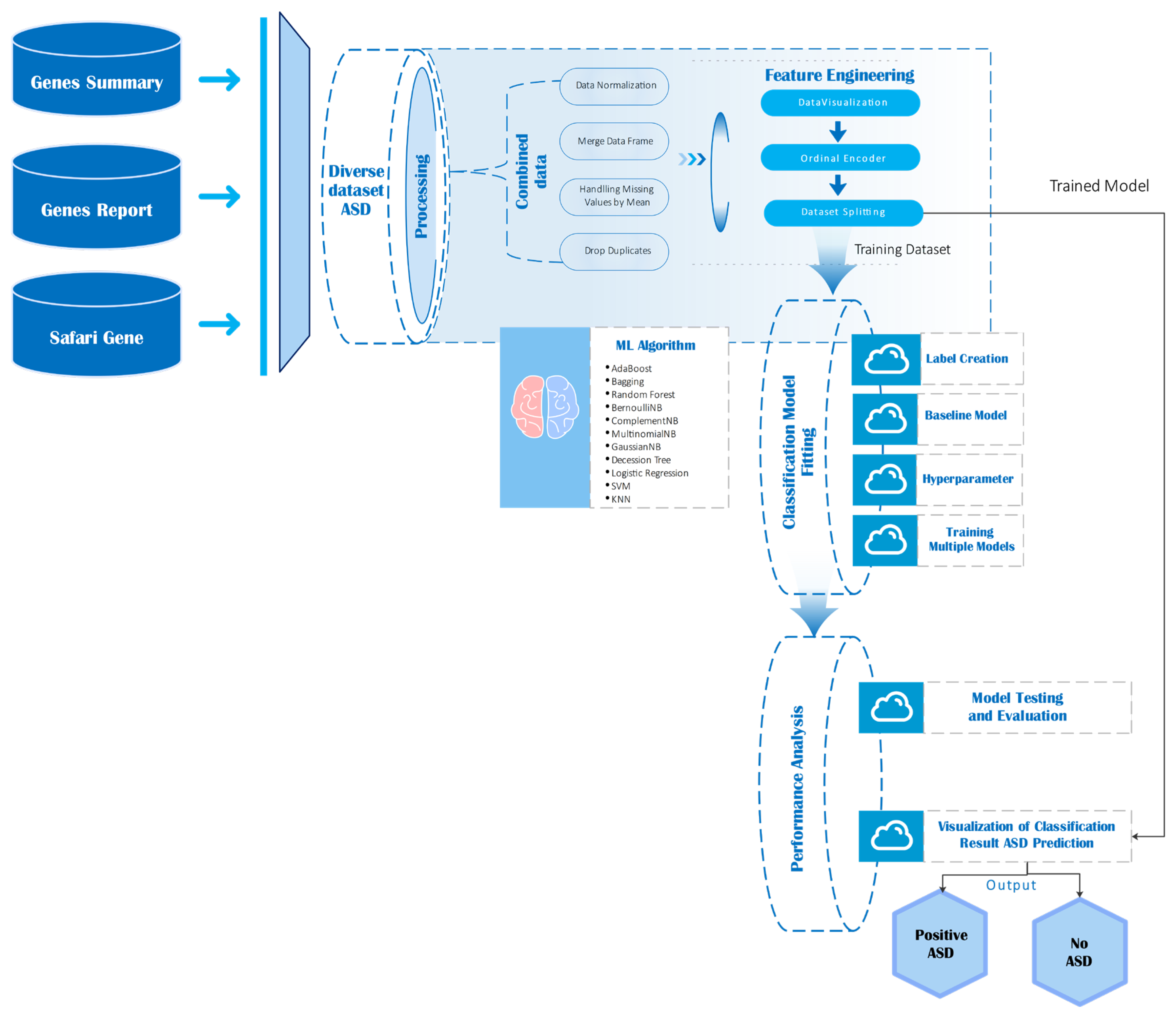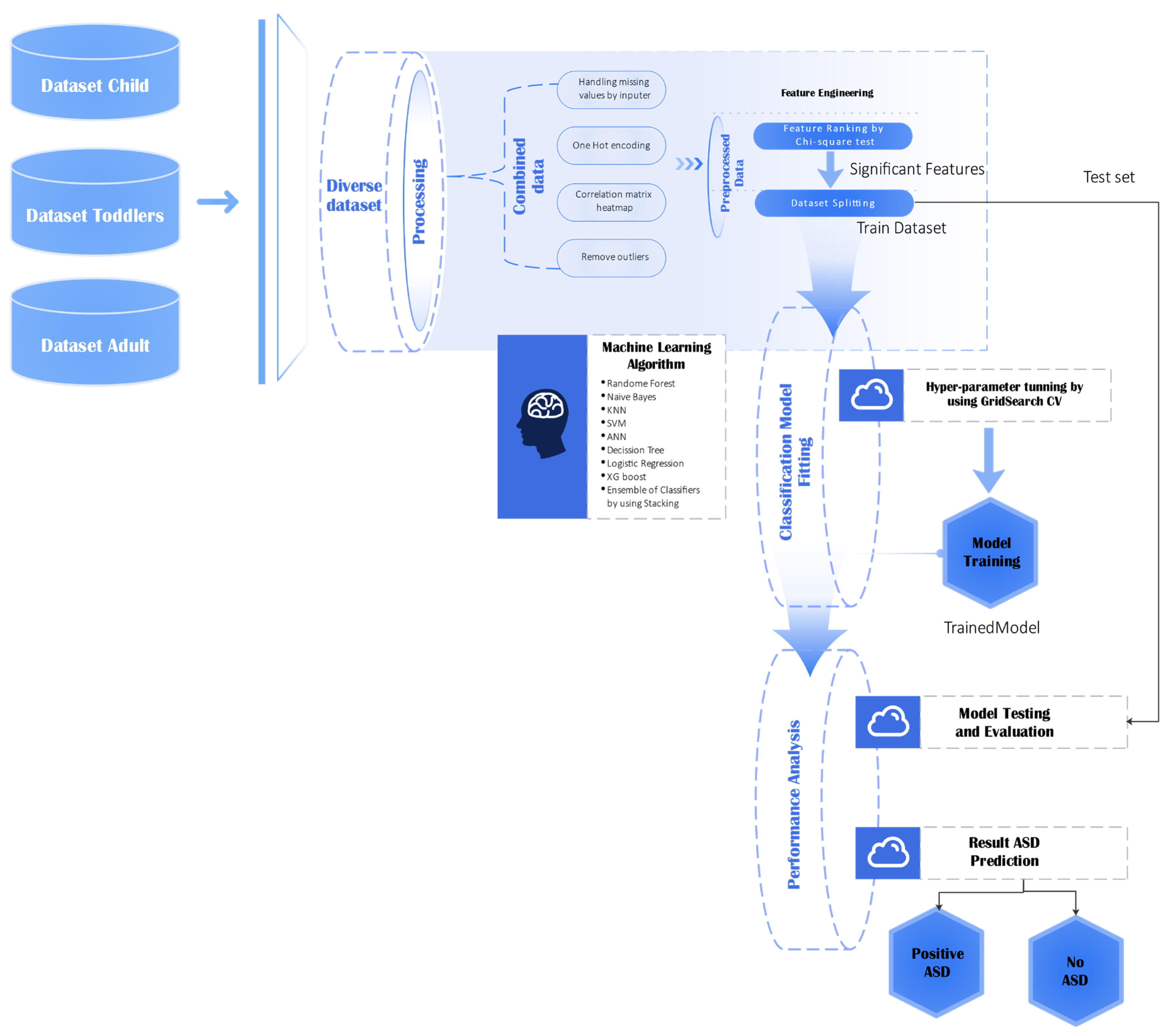 The predicted probabilities from these individual classifiers are then combined at the decision level through a late fusion mechanism wherein a custom designed Multi- Layer Perceptron (MLP) classifier is employed to perform the final diagnosis of ASD, enabling the framework to capture complementary patterns across data types. This fusion-driven architecture not only improves overall diagnostic performance but also provides a robust and scalable solution for early ASD detection across different age groups and clinical environments. Following this, several machine learning algorithms have been developed and refined via strict hyperparameter optimization methods [