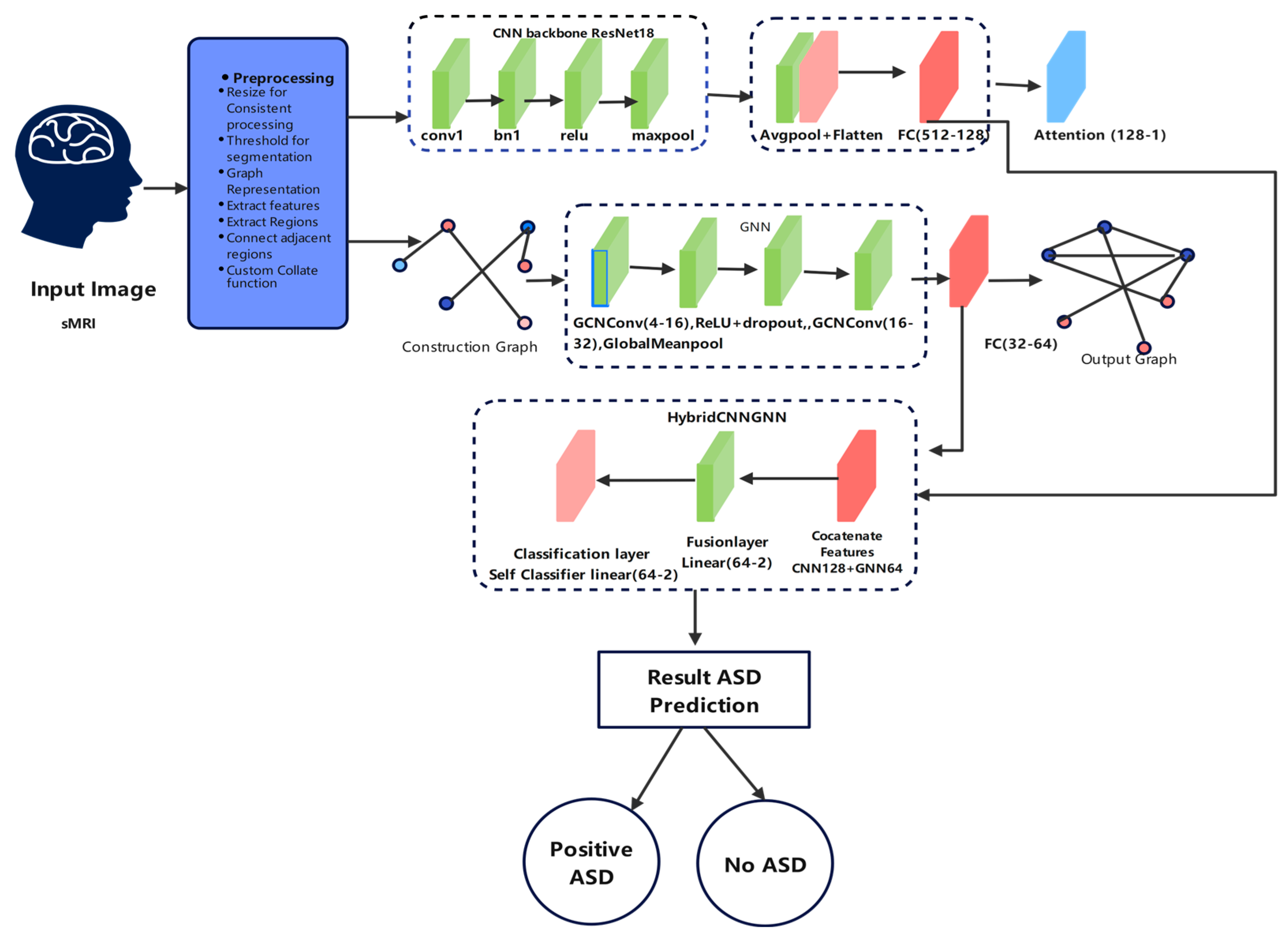 Figure 7 along its path. The model starts with preprocessing phases applied to structural MRI (sMRI) data, next feature extraction with a CNN backbone (ResNet18) and graph building for GNN processing. One joint classification layer, which forecasts whether the input belongs to the ASD or the control group, combines these parallel representations. The pipeline uses local spatial characteristics and global relational structures, and it also includes interpretability attention mechanisms.