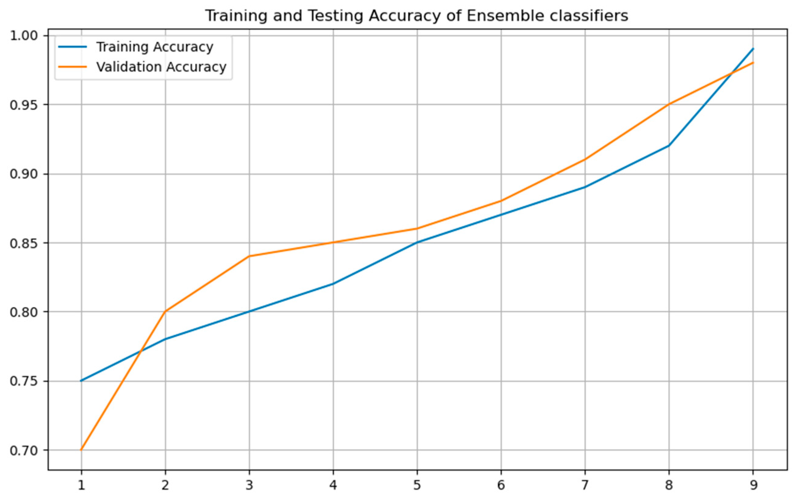 Figure 10 contrasts the ensemble model’s validation and training accuracy over different tree depths. This study shows that the group exhibited strong validation performance without any symptoms of overfitting, therefore implying efficient depth adjustment.