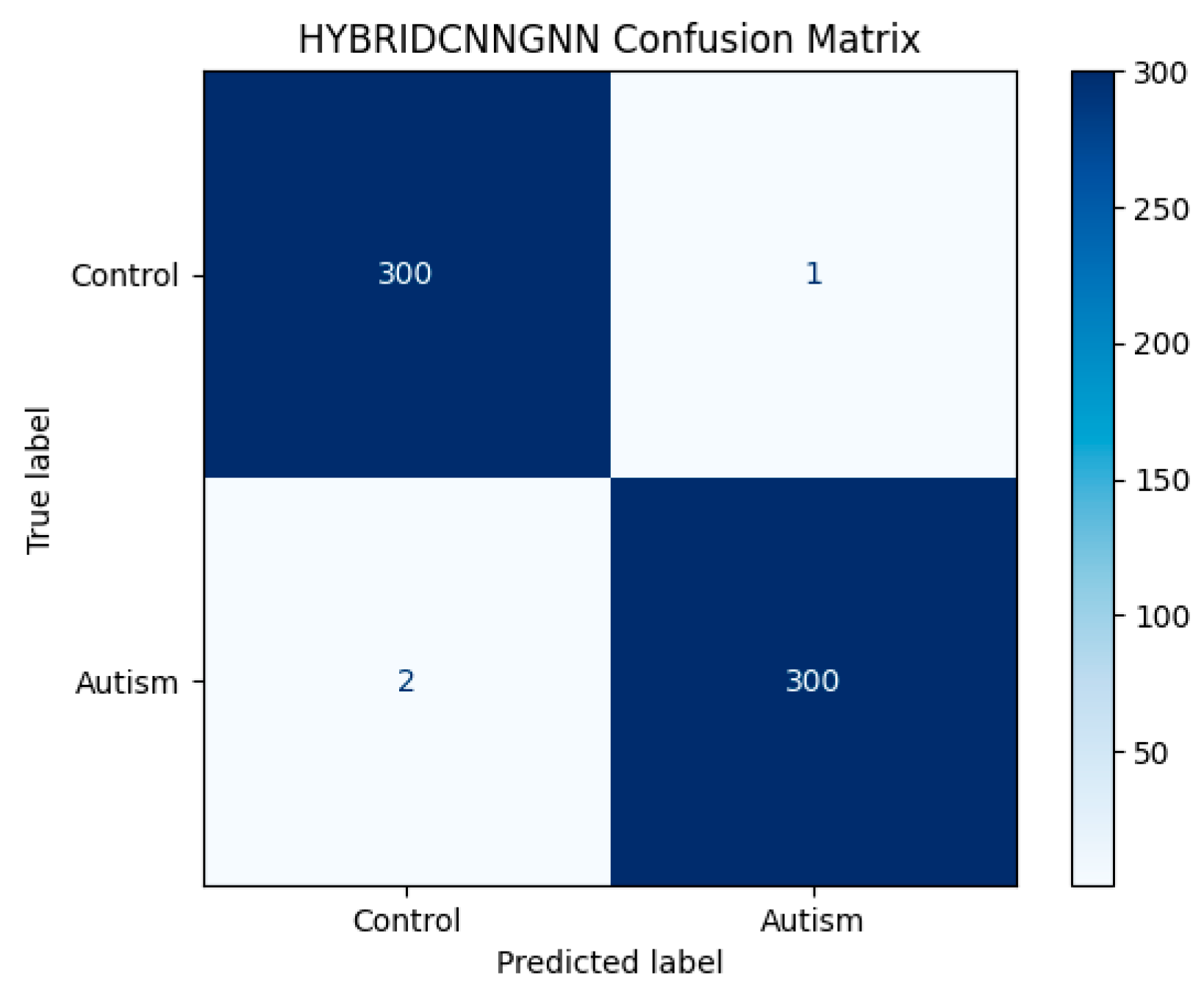 Structural MRI data, processed through deep learning architectures, further support the role of neuroanatomical alterations in ASD. The hybrid model integrating Convolutional Neural Networks (CNN) with Graph Neural Networks (GNN) achieved a validation accuracy of 96.32%, outperforming both standalone CNN (92.53%) and GNN (88.10%) implementations. The improved performance of the hybrid model indicates that combining local spatial features with graph-based topological representations enhances the ability to detect ASD-relevant neurostructural patterns, such as atypical cortical thickness, volume, and connectivity.