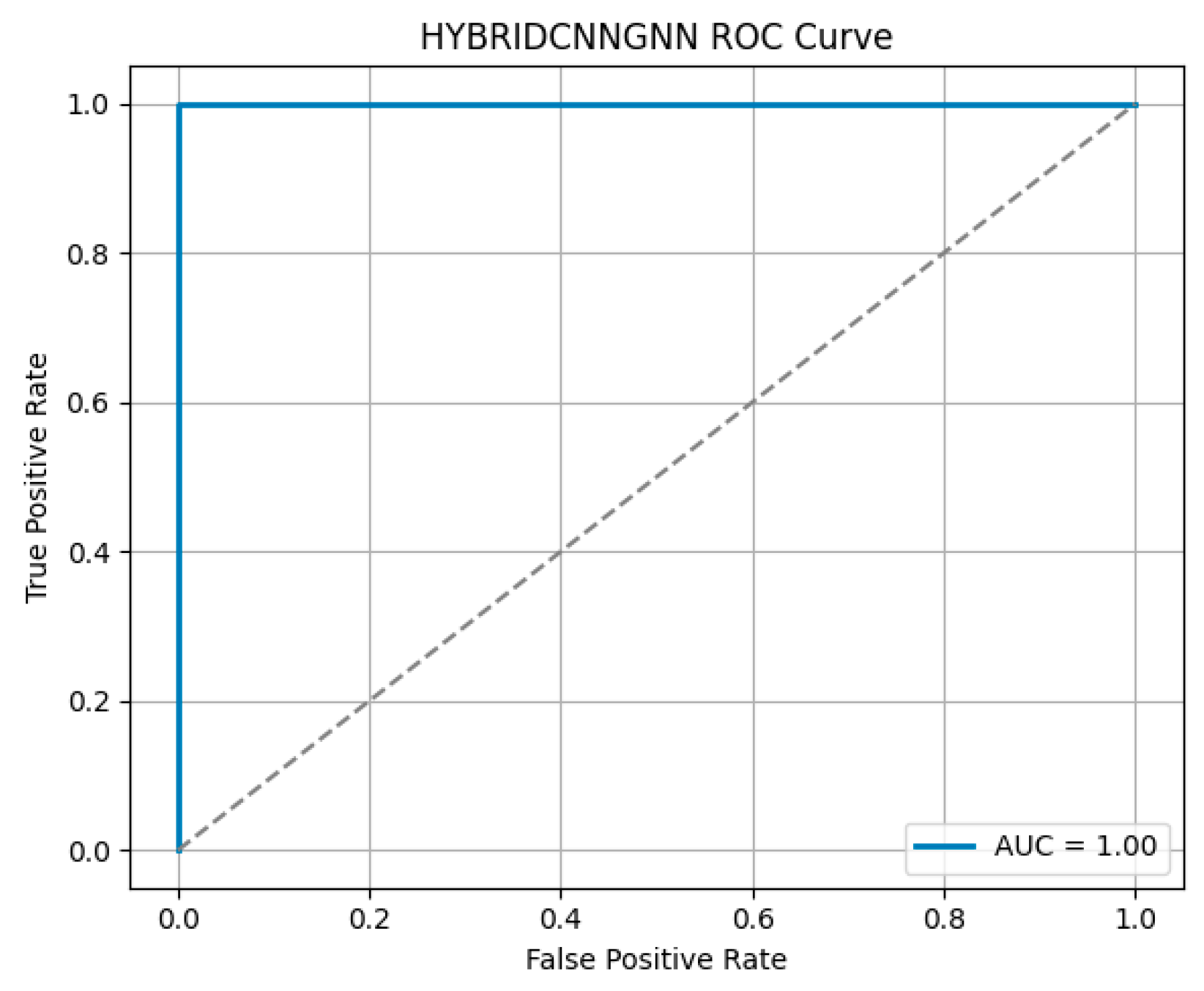 . Learning rate scheduling was handled using ReduceLROnPlateau, which reduced the learning rate by a factor of 0.5 if validation loss plateaued over 3 consecutive epochs. The dataset was divided into 70% training, 20% testing, and 10% validation, and training was carried out over 30 epochs with a batch size of 16. The version with the best validation performance was saved using model checkpointing. Evaluation was done using conventional metrics including accuracy, precision, recall, and F1-score. Further interpretability is provided through confusion matrices and ROC curve analysis. The Area Under the Curve (AUC) was calculated using: