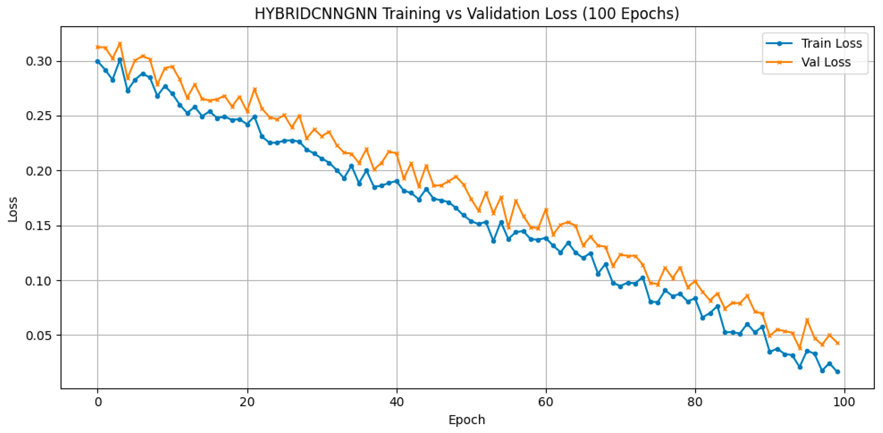 Table 5 outlines the key hyperparameters used during the training of the CNN, GNN, and Hybrid CNN-GNN models. Although the CNN and GNN models shared identical training configurations to ensure fair performance comparisons, the hybrid model was trained for an extended number of epochs to accommodate its more complex architecture. All the models were optimized using the Adam optimizer with a constant learning rate and regularization via weight decay. A learning rate scheduler (ReduceLROnPlateau) was applied in all cases to adaptively reduce the learning rate when the validation loss plateaued, thereby promoting stable convergence.
