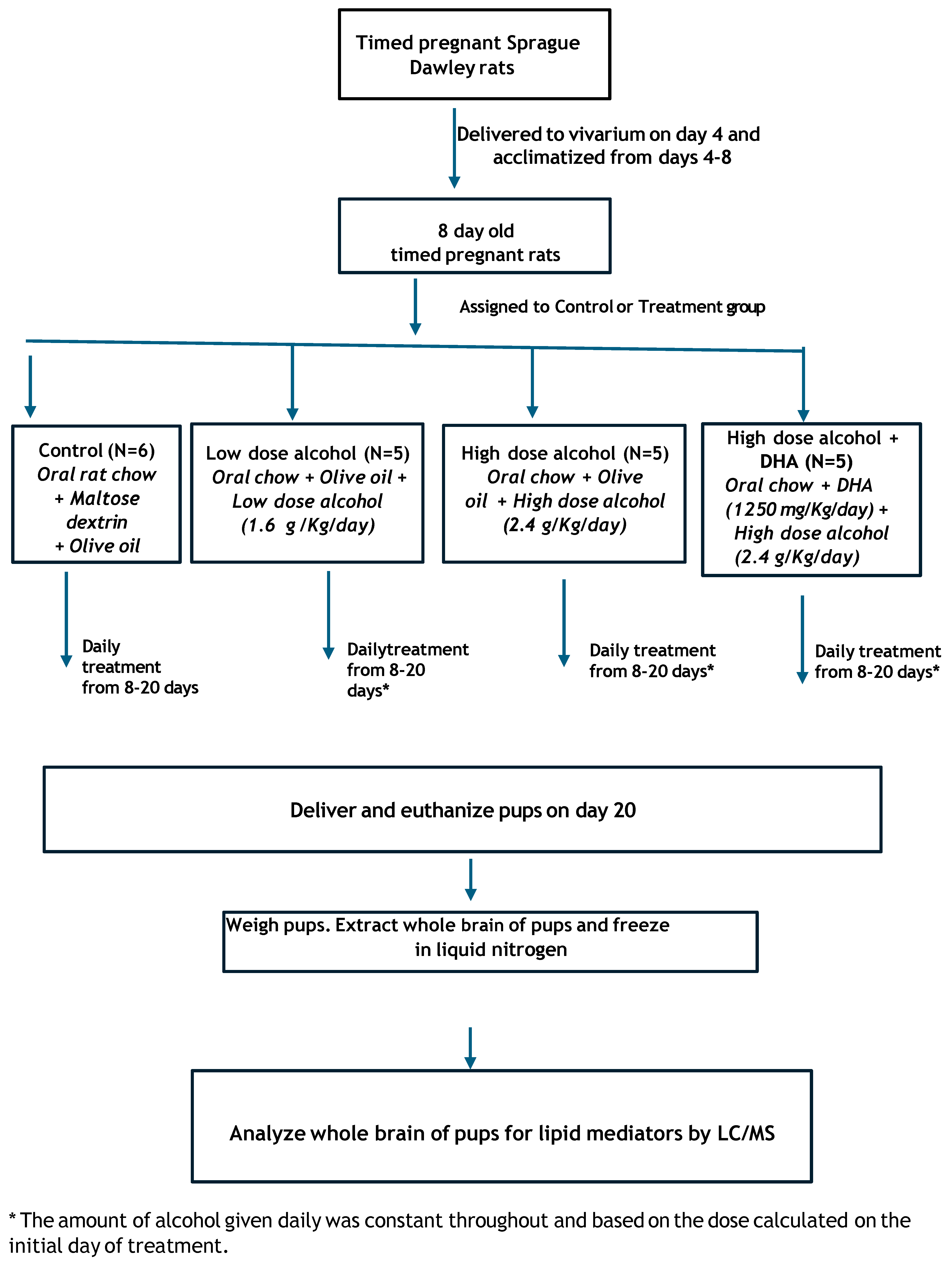- The present study of brain lipid mediators in the pups is only the first step in assessing the beneficial effects of DHA in mitigating the adverse impacts of alcohol on the fetal brain. Demonstrating an improvement in pups’ behavior is also necessary. We have an ongoing follow-up study using the same protocol which examines the anxiety behavior in rat pups at 6 weeks of postnatal age. Preliminary observations indicate that female rats perform better than male pups in the anxiety tests, which highlights the importance of sex.