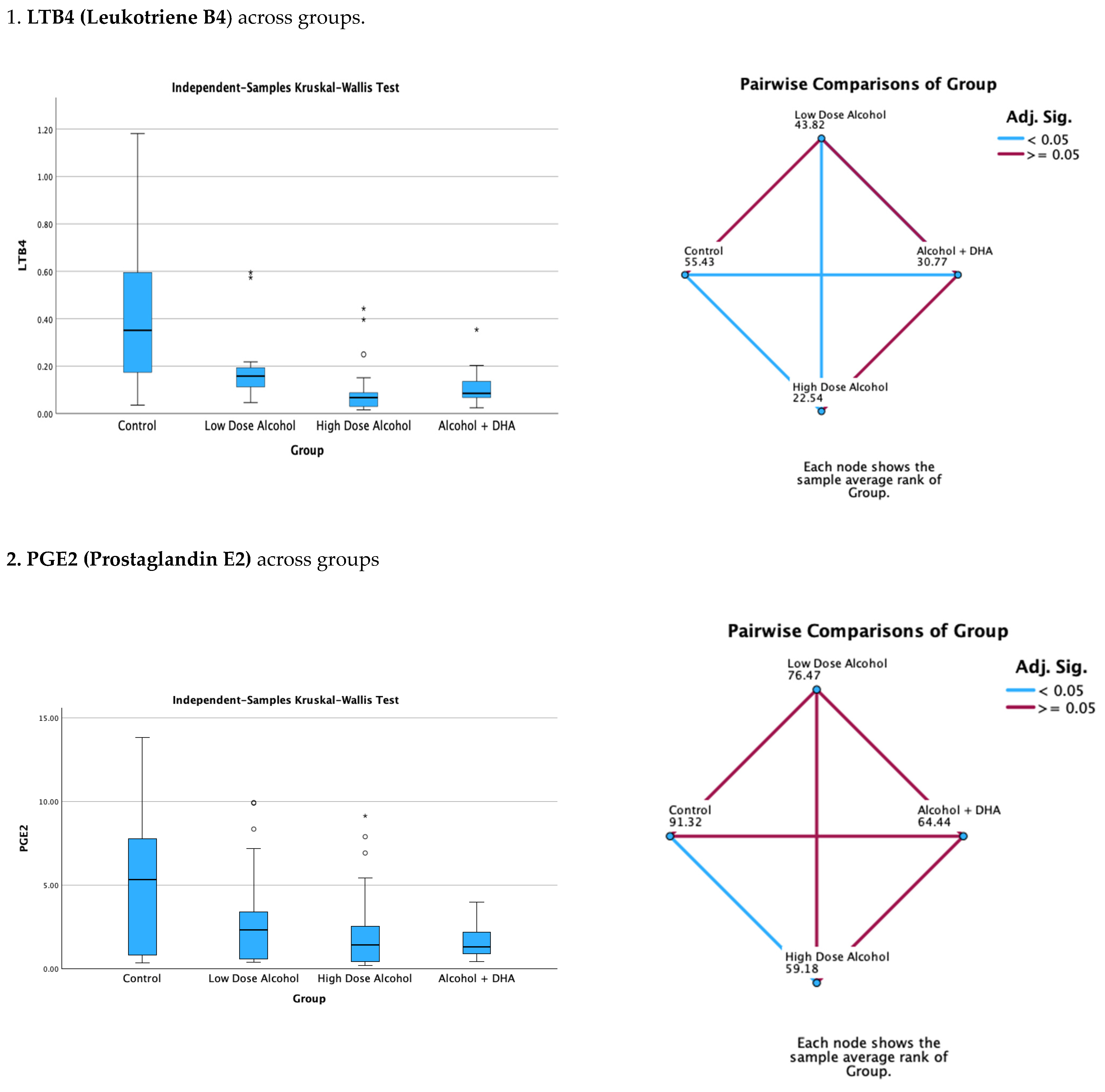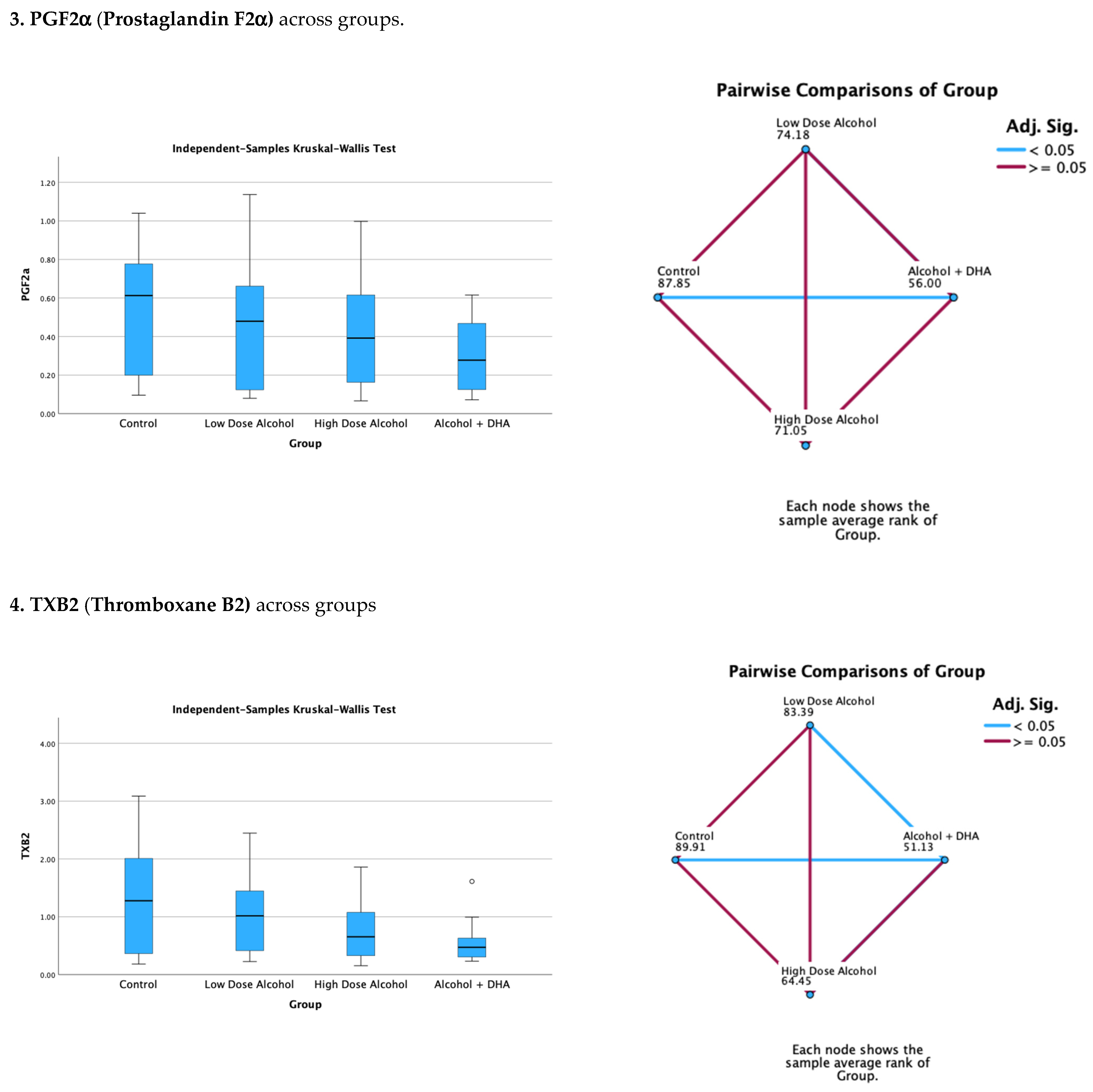 - The high-dose alcohol + DHA group was significantly lower than the control in LTB4, PGF2α, and TXB2.