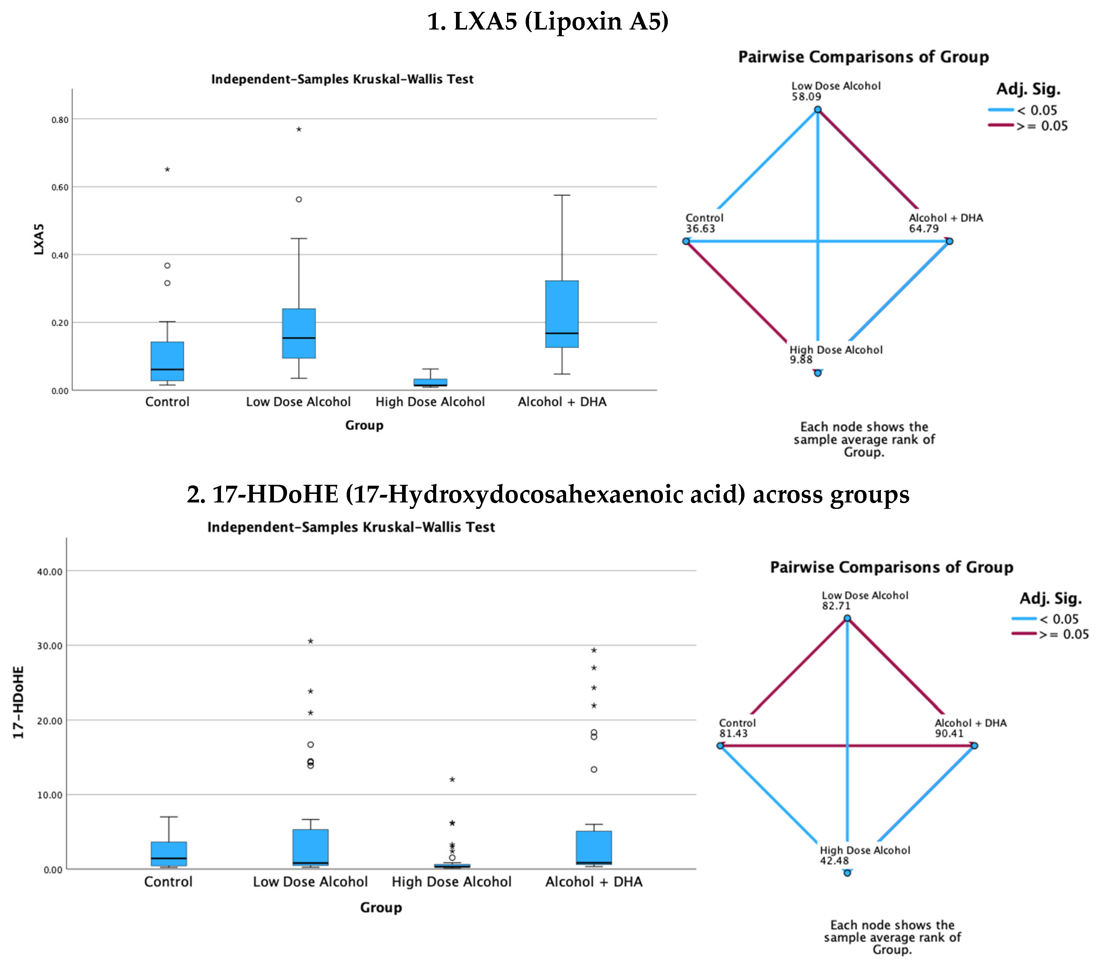 - High-dose alcohol was significantly lower than low-dose alcohol in LXA5, 4-HDoHE, and 17-HDoHE and vs. the control in 4-HDoHE and 17-HDoHE.