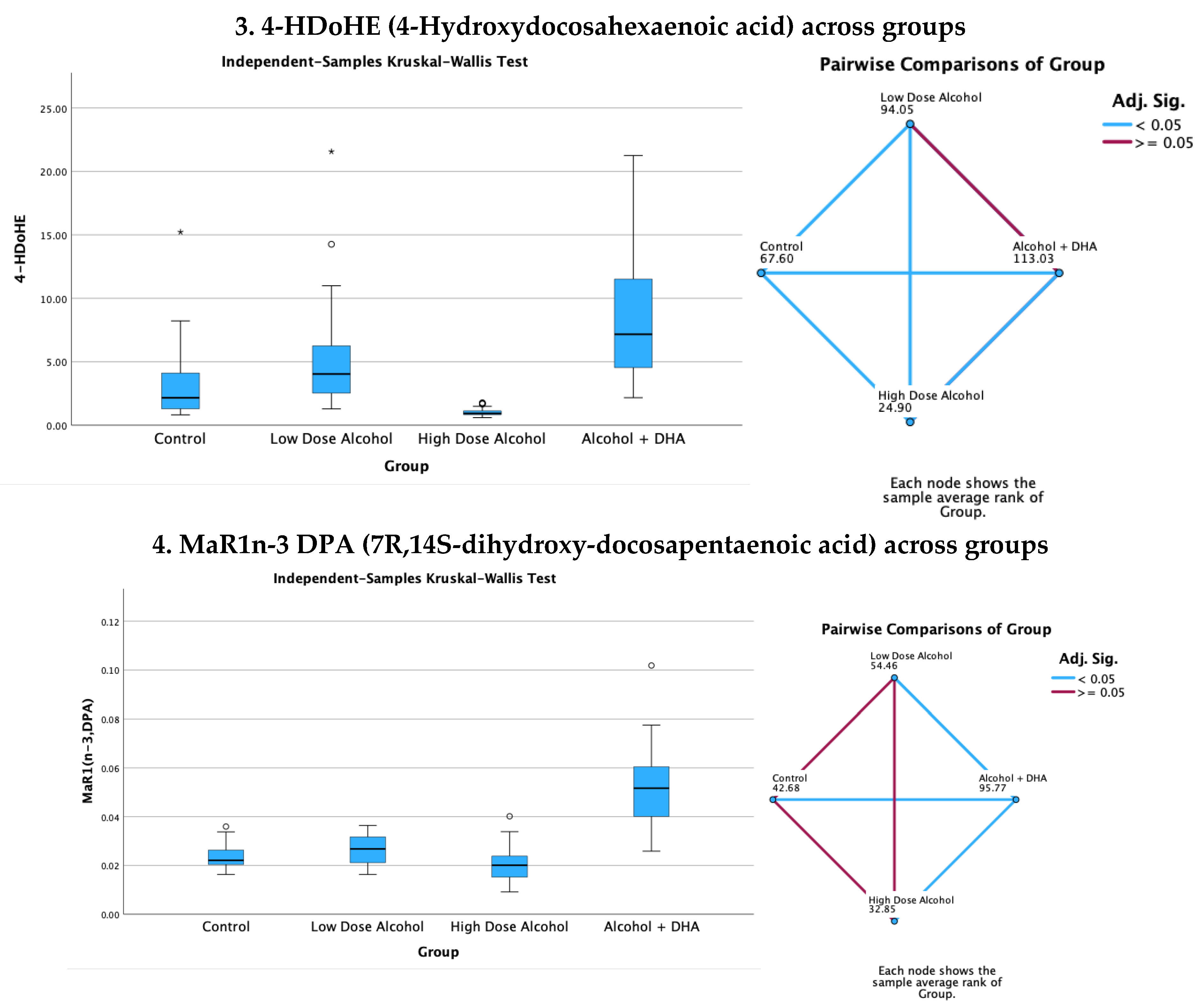 - The high-dose alcohol group was significantly lower than the control in 4-HDoHE and 17-HDoHE. Alcohol + DHA was significantly higher than the control in LXA5, MaR1n-3 DPA, and 4-HDoHE.