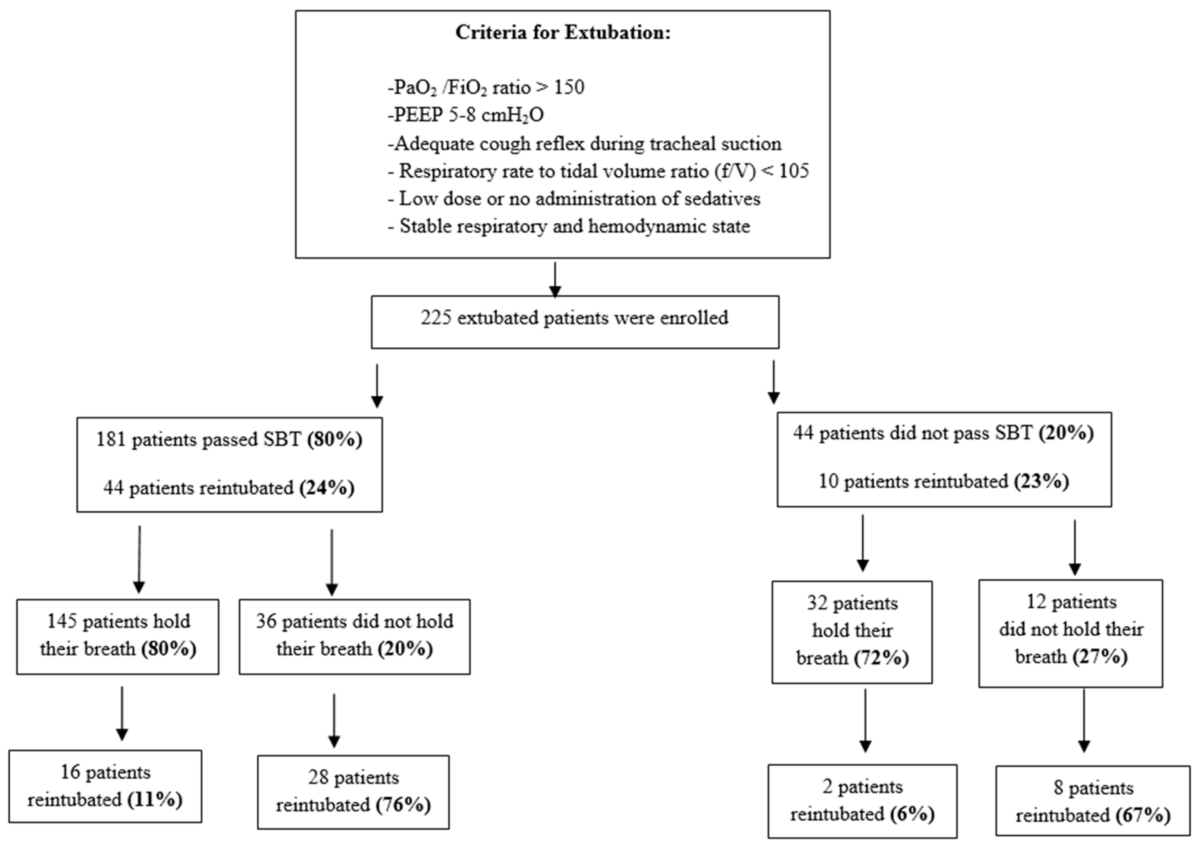The study included 225 patients. One hundred eighty-one patients passed SBT successfully (80%). Among those 181 patients who passed SBT, 144 patients succeeded in holding their breath (80%), and only 16 patients were reintubated (11%), while 37 patients did not succeed in holding their breath (20%), and 28 patients were reintubated (76%).