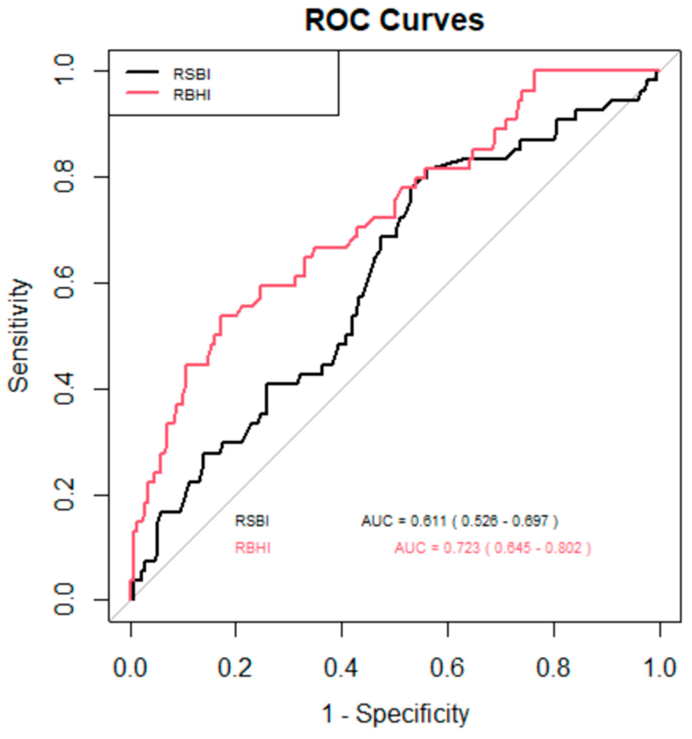 In this study the ROC curve of RBHI > 3 (sensitivity 75%, specificity 59%) demonstrated a stronger discriminative power compared to RSBI (sensitivity 47%, specificity 79%), with AUC of 0.723 (95% CI: 0.645–0.802) as compared to RSBI which had an AUC of 0.611 (95% CI: 0.526–0.697). This suggests that RBHI is more effective at predicting successful extubation outcomes than RSBI (