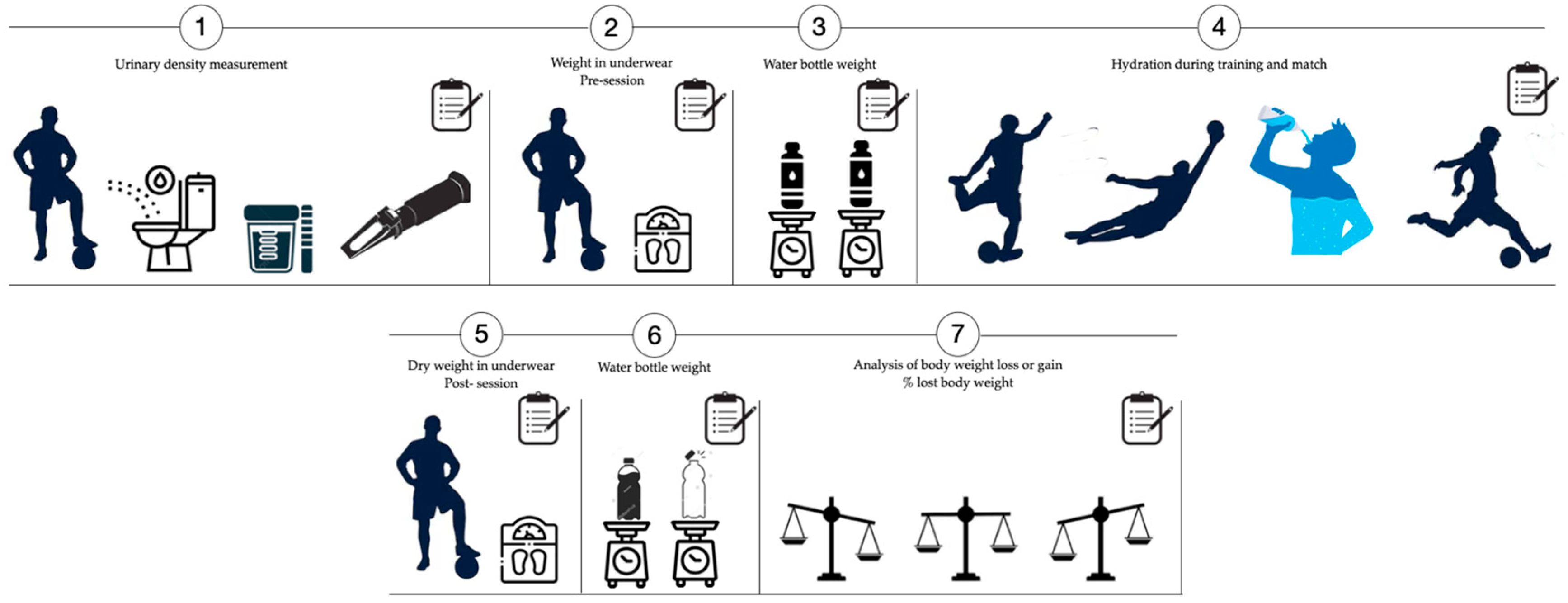 - Chapelle, L.; Tassignon, B.; Rommers, N.; Mertens, E.; Mullie, P.; Clarys, P. Pre-exercise hypohydration prevalence in soccer players: A quantitative systematic review. Eur. J. Sport Sci. 2019, 20, 744–755. [Google Scholar] [CrossRef] [PubMed]