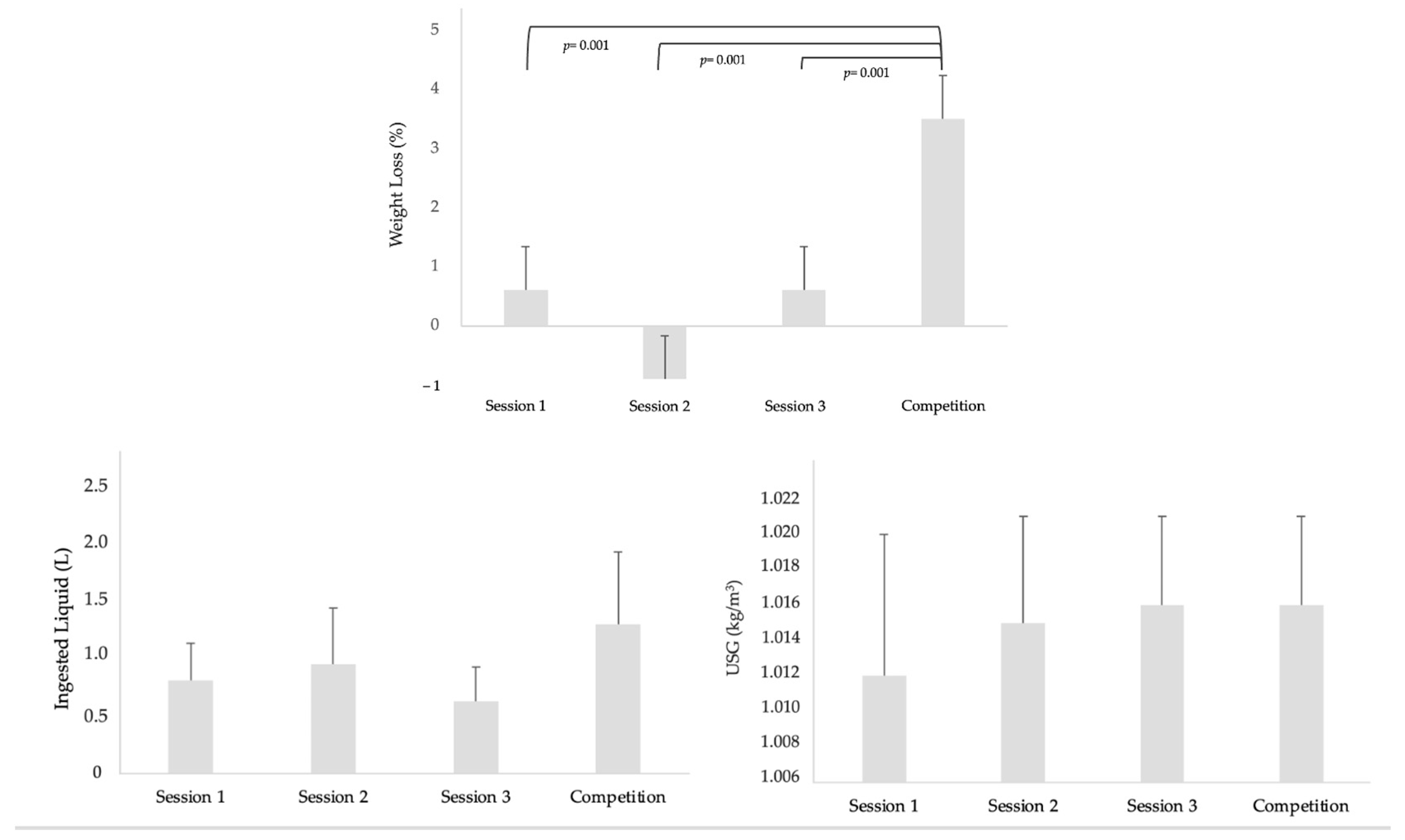Day | Weight Loss (%) | Ingested Liquid (L) | USG (kg/m3) | |||||||||||||||