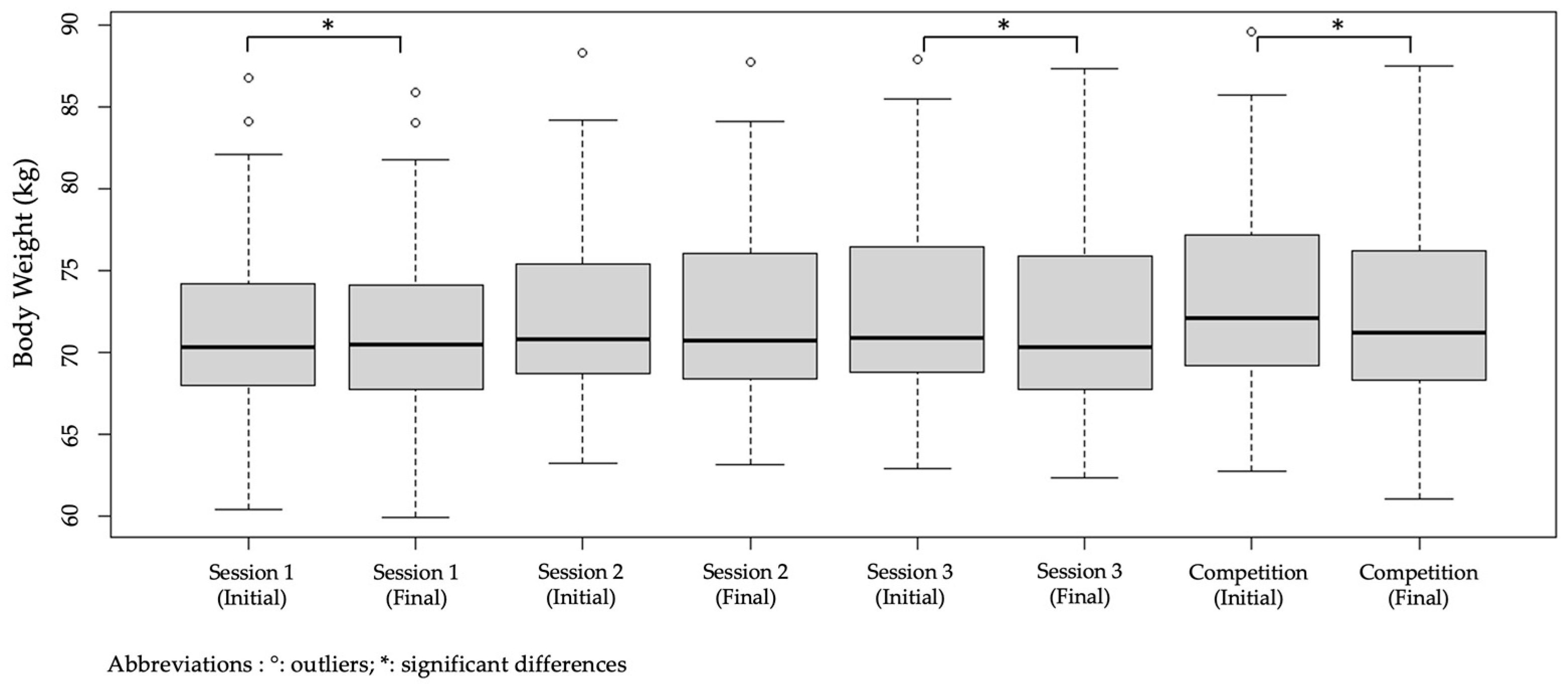 Initial Body Mass (kg) | Session 1 | −3.960 | 1.590 | 0.012 † |
