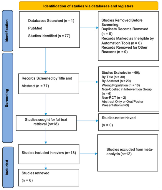 - Intervention: Studies utilizing non-validated or non-standardized GIPS detection methods (e.g., in-house assays without demonstrated analytical validation per FDA/EMA guidelines, or methods lacking established sensitivity/specificity for gluten peptides detection) were excluded to ensure methodological consistency across included studies.