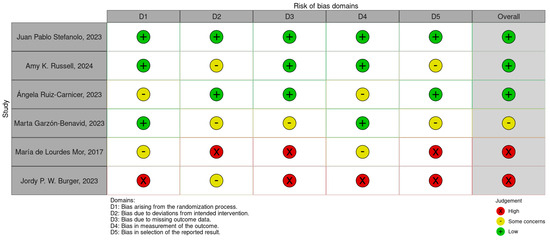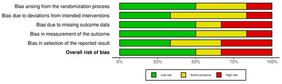 The risk of bias (RoB) for the six included studies was assessed using the Cochrane Risk of Bias (RoB 2.0) tool. This evaluation considered the following domains: bias arising from the randomization process, bias due to deviations from intended interventions, missing outcome data, measurement of outcomes, and selection of reported results. A traffic-light plot and summary plot are provided in Figure 2 and Figure 3, visually summarizing the risk levels across these domains and the overall quality of the studies.