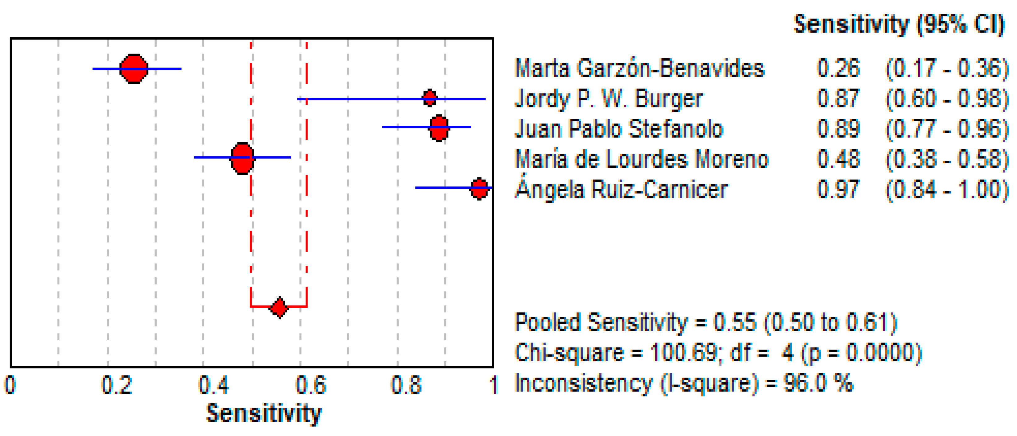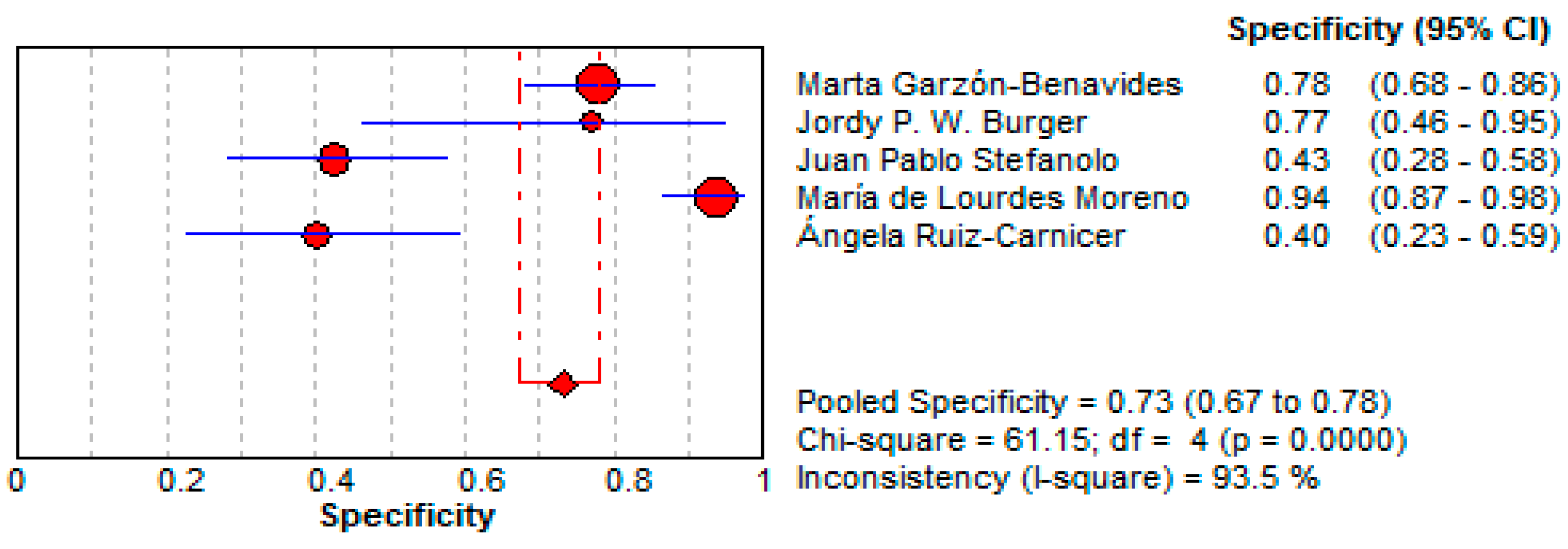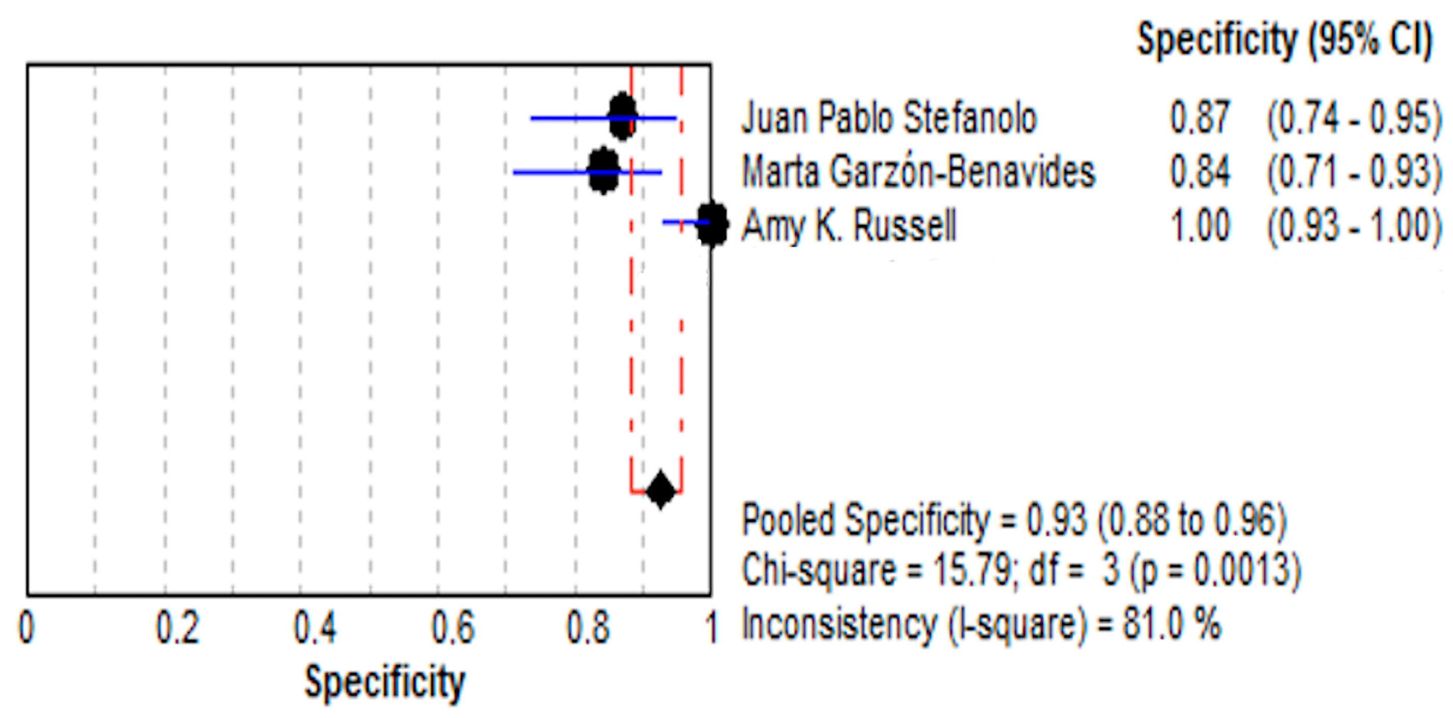 - The specificity values ranged from 84.0% to 100% across the included studies, with moderate heterogeneity (I2 = 81.0%). These findings are depicted in Figure 5.