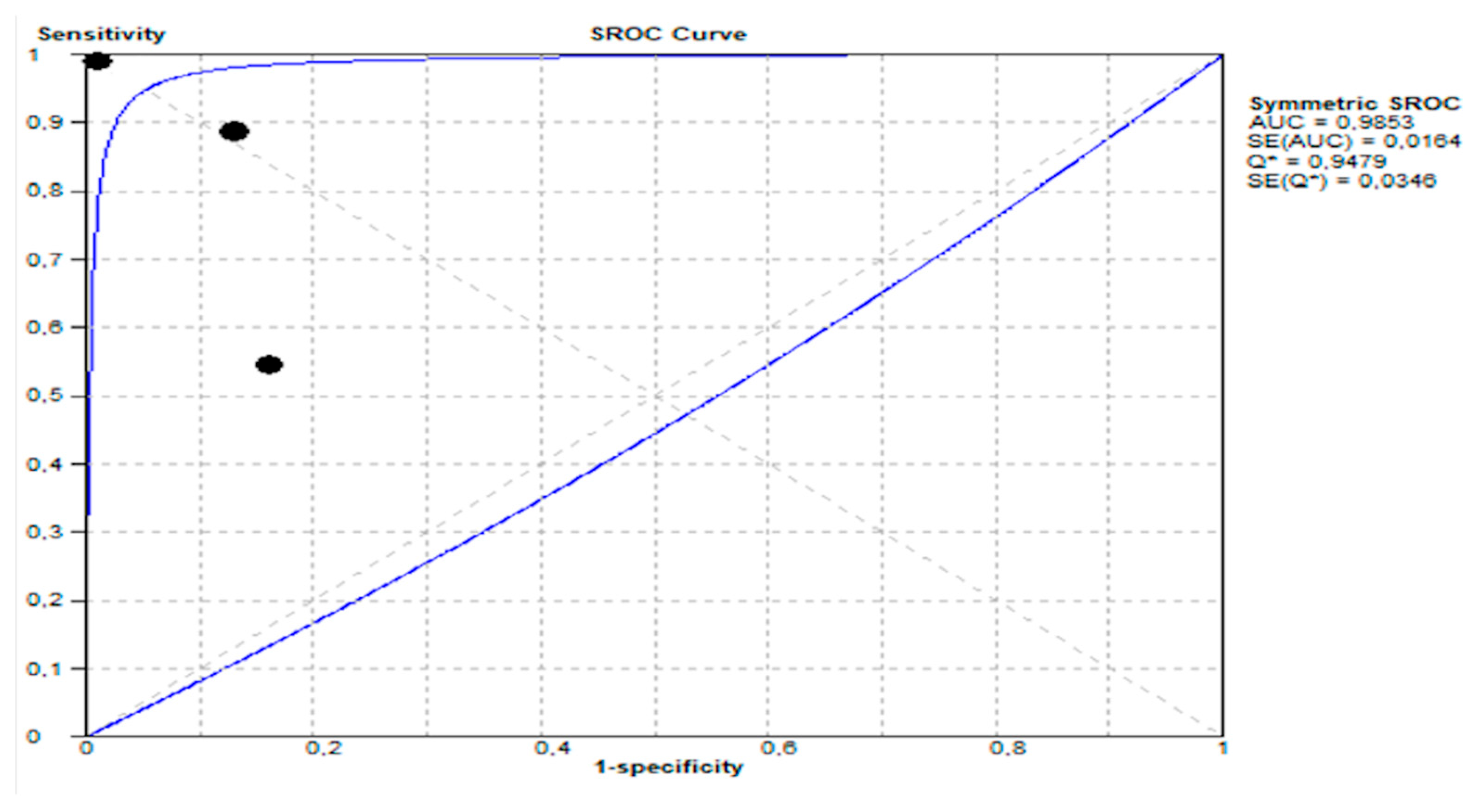 - The area under the SROC curve (AUC) was 0.9853, demonstrated in Figure 6 shows excellent diagnostic performance.