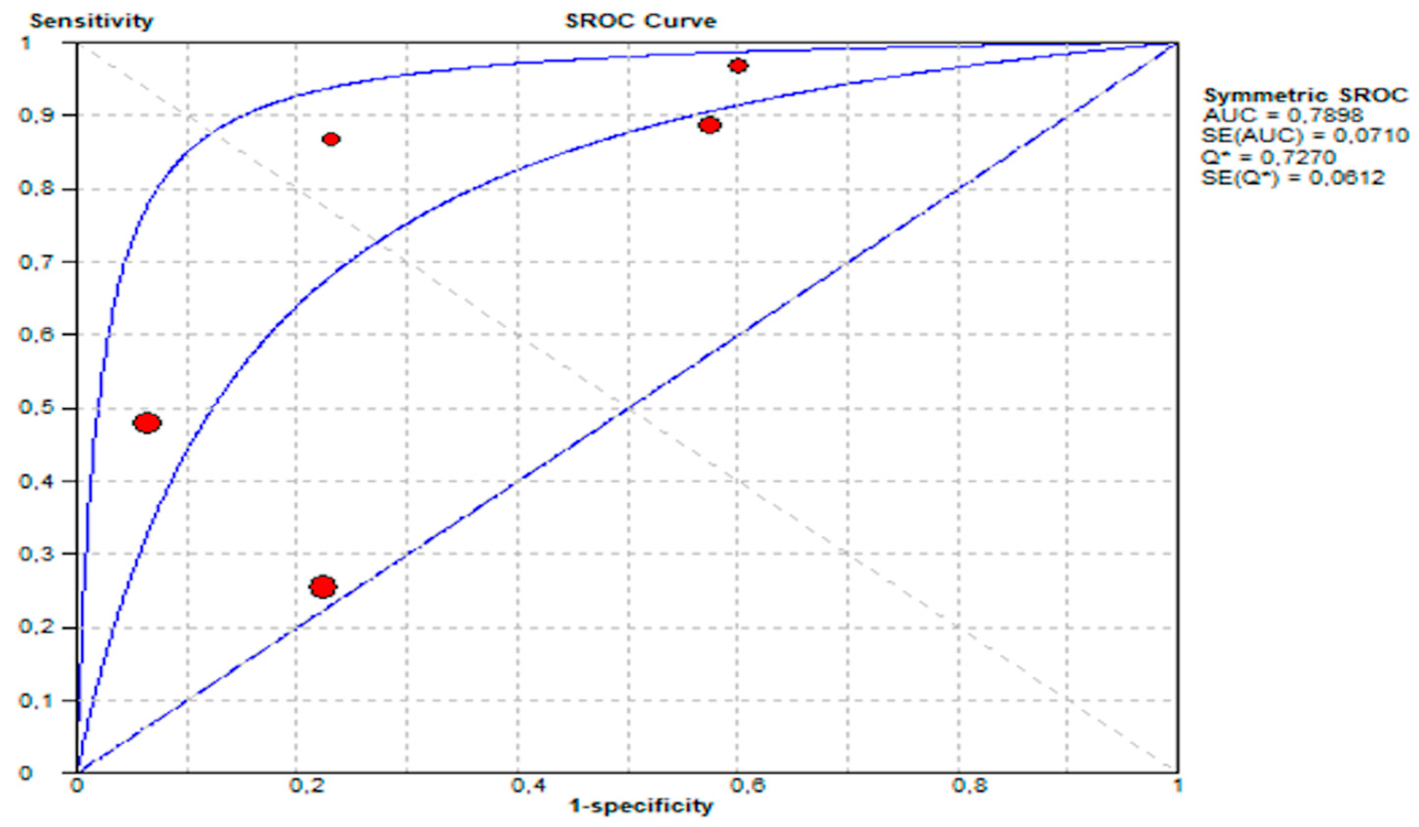 - The area under the SROC curve (AUC) was 0.7898, demonstrating moderate diagnostic performance. This presented in Figure 9.