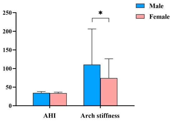 Sex Differences Between AHI and Arch Stiffness. Notes: Values are presented as mean ± SD. Error bars indicate SD. * indicates a statistically significant difference between males and females (p < 0.05).