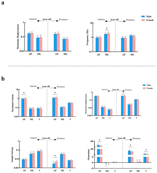 As shown in Figure 3, during the pre-seat-off phase of the STS task, females exhibited a higher mediolateral COP frequency (p = 0.045) and a higher maximum anteroposterior COM velocity (p = 0.025) compared to males, while their anteroposterior COM momentum was significantly lower (p < 0.001). In the post-seat-off phase, females demonstrated greater maximum anteroposterior COM displacement (p = 0.047), higher maximum velocity (p = 0.004), and significantly higher sample entropy (p < 0.001) than males. However, their anteroposterior and vertical COM momentum values remained significantly lower than those of males (p < 0.001).