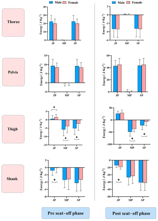 Sex Differences in Energy Flow During the STS. Notes: Values are presented as mean ± SD. Error bars indicate SD. * indicates a statistically significant difference between males and females (p < 0.05).