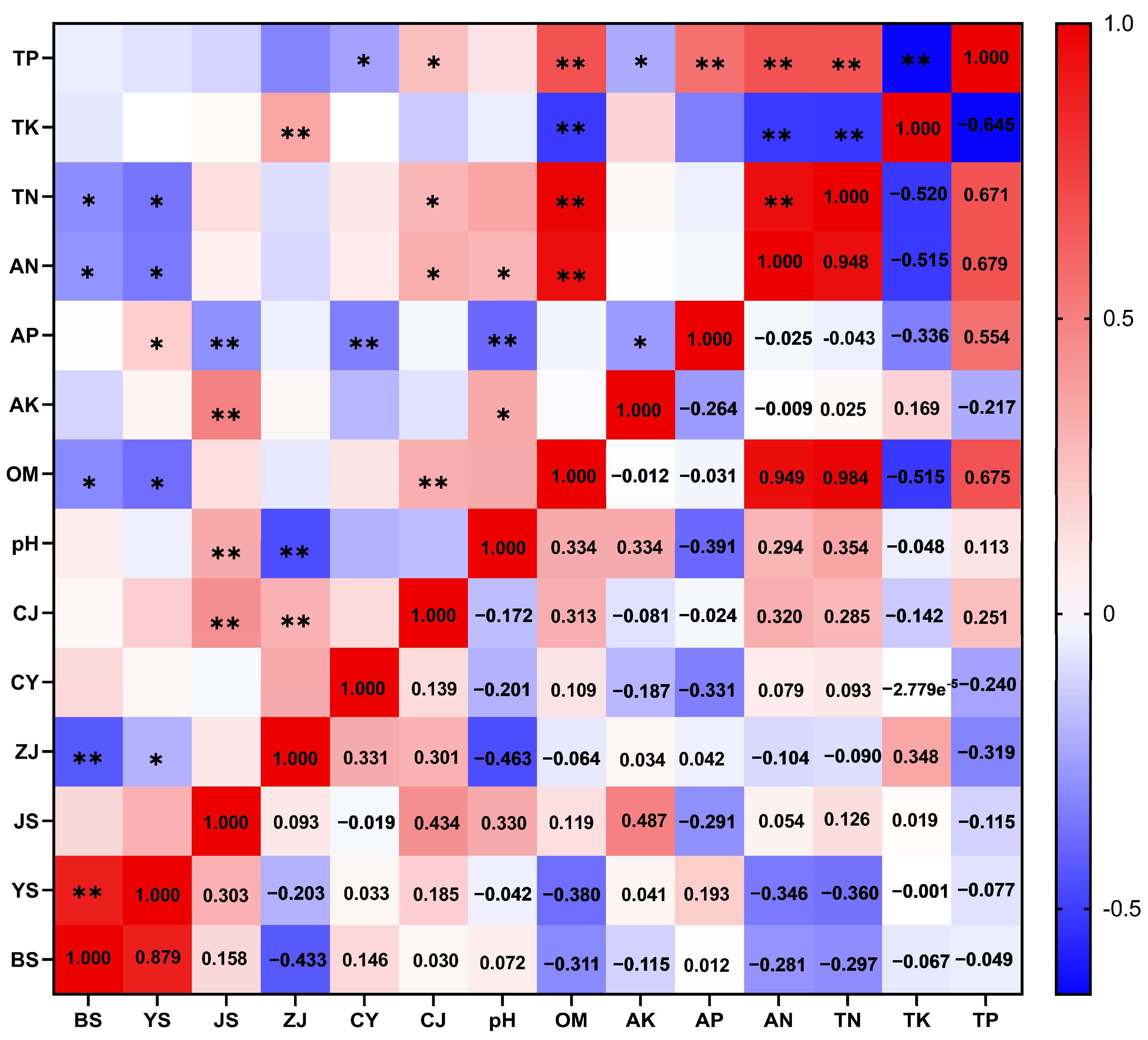 Figure 1. Spearman correlation analysis of soil physical and chemical indicators and lignans (Spearman’s ρ). TP: total phosphorus; TK: total potassium; TN: total nitrogen; AN: available nitrogen; AP: available phosphorus; AK: available potassium; OM: soil organic matter; pH: soil pH; CJ: Schisandrol A; CY: Schisandrol B; ZJ: Schisantherin A; JS: Schisandrin A; YS: Schisandrin B; BS: Schisandrin C. TL: total lignans. The lower right triangle displays Spearman’s correlation coefficients (ρ), while the upper left triangle indicates statistical significance: * denotes p < 0.05, ** denotes p < 0.01.