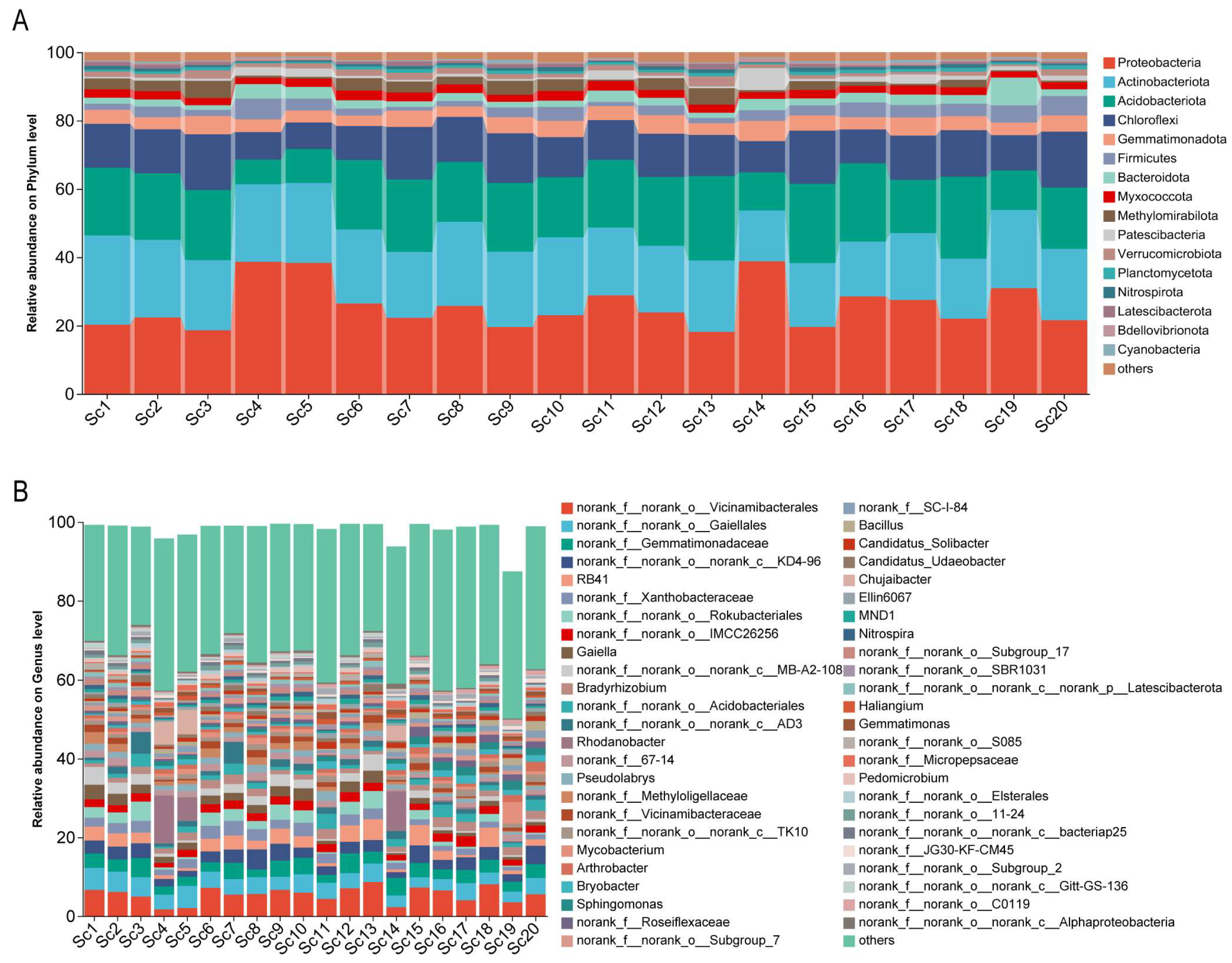 Figure 2. Community barplot analysis of rhizosphere bacterial composition associated with different S. chinensis resources. (A) Relative abundance of rhizosphere bacterial communities at the phylum level. (B) Relative abundance of rhizosphere bacterial communities at the generic level. Sc1-Sc20: S. chinensis at different cultivation sites.
