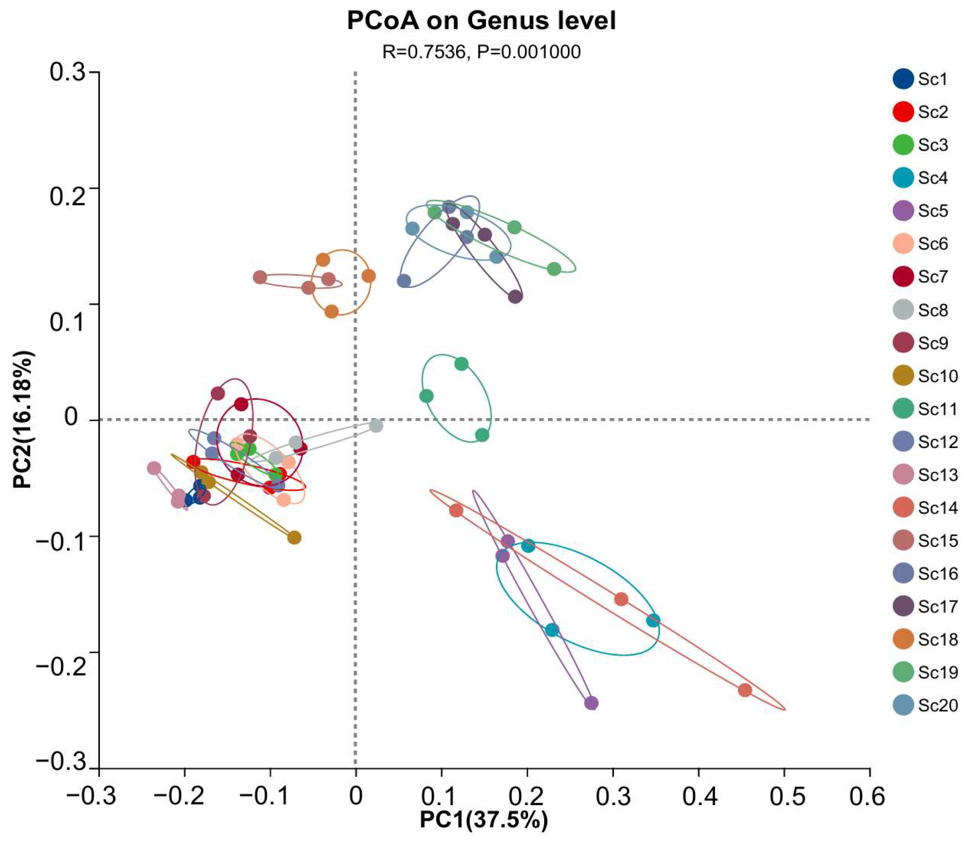 Figure 3. Principal coordinates analysis (PCoA) of rhizosphere microbial communities associated with different S. chinensis resources. Sc1–Sc20: S. chinensis resources. Clustering patterns reflect differences in microbial composition. The analysis was performed at the genus level. PC1 and PC2 explain 37.5% and 16.18% of the total variation, respectively. Statistical significance was assessed using PERMANOVA (R = 0.7536, p = 0.001).
