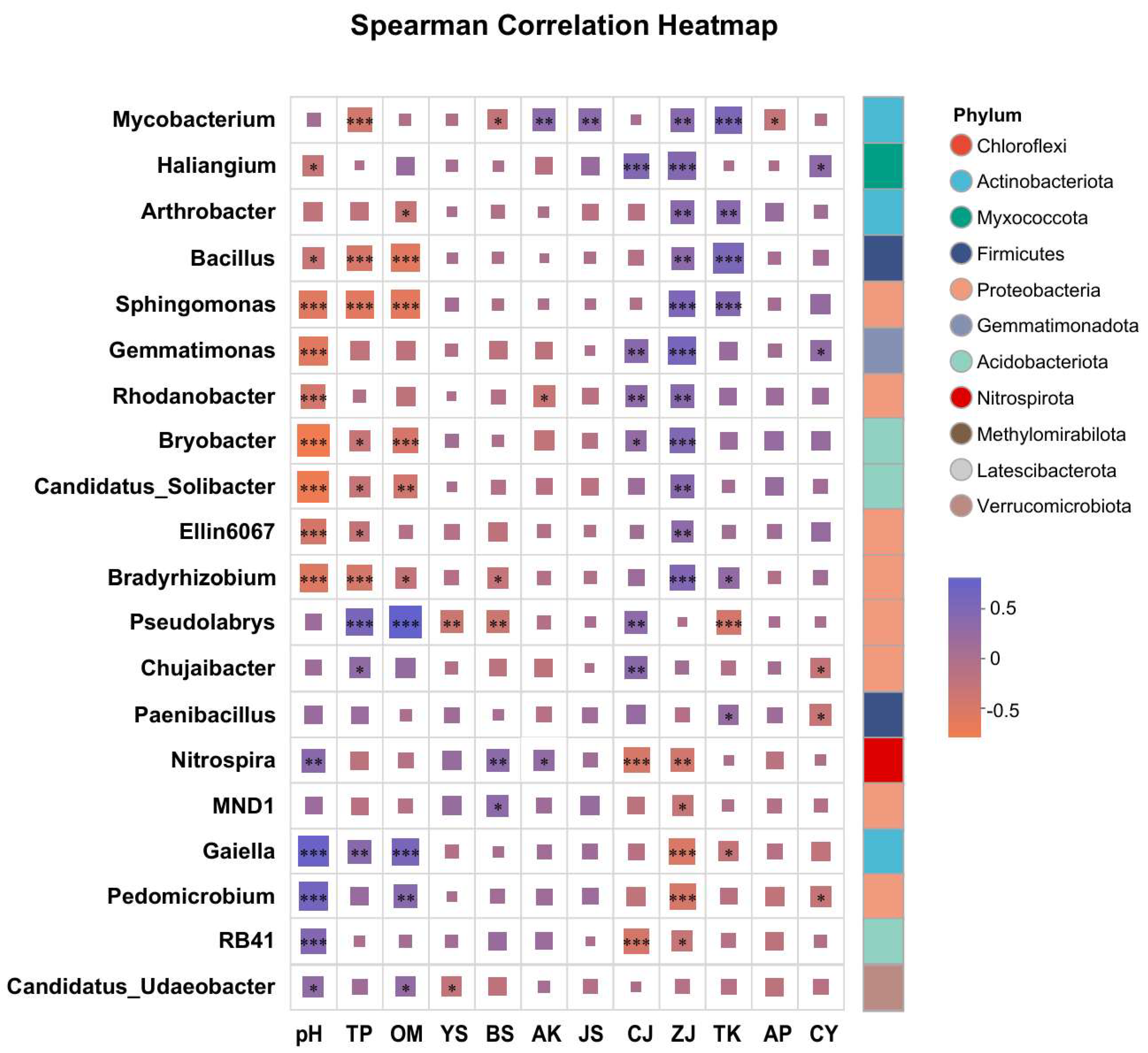Figure 4. Spearman correlation analysis of lignan-associated rhizosphere microorganisms with soil physicochemical properties and lignan components in S. chinensis. TP: total phosphorus; TK: total potassium; TN: total nitrogen; AN: available nitrogen; AP: available phosphorus; AK: available potassium; OM: soil organic matter; pH: soil pH; CJ: schisandrol A; CY: schisandrol B; ZJ: schisantherin A; JS: schisandrin A; YS: schisandrin B; BS: schisandrin C. TL: total lignans. Significant correlations are indicated by asterisks: * p < 0.05, ** p ≤ 0.01, *** p ≤ 0.001.