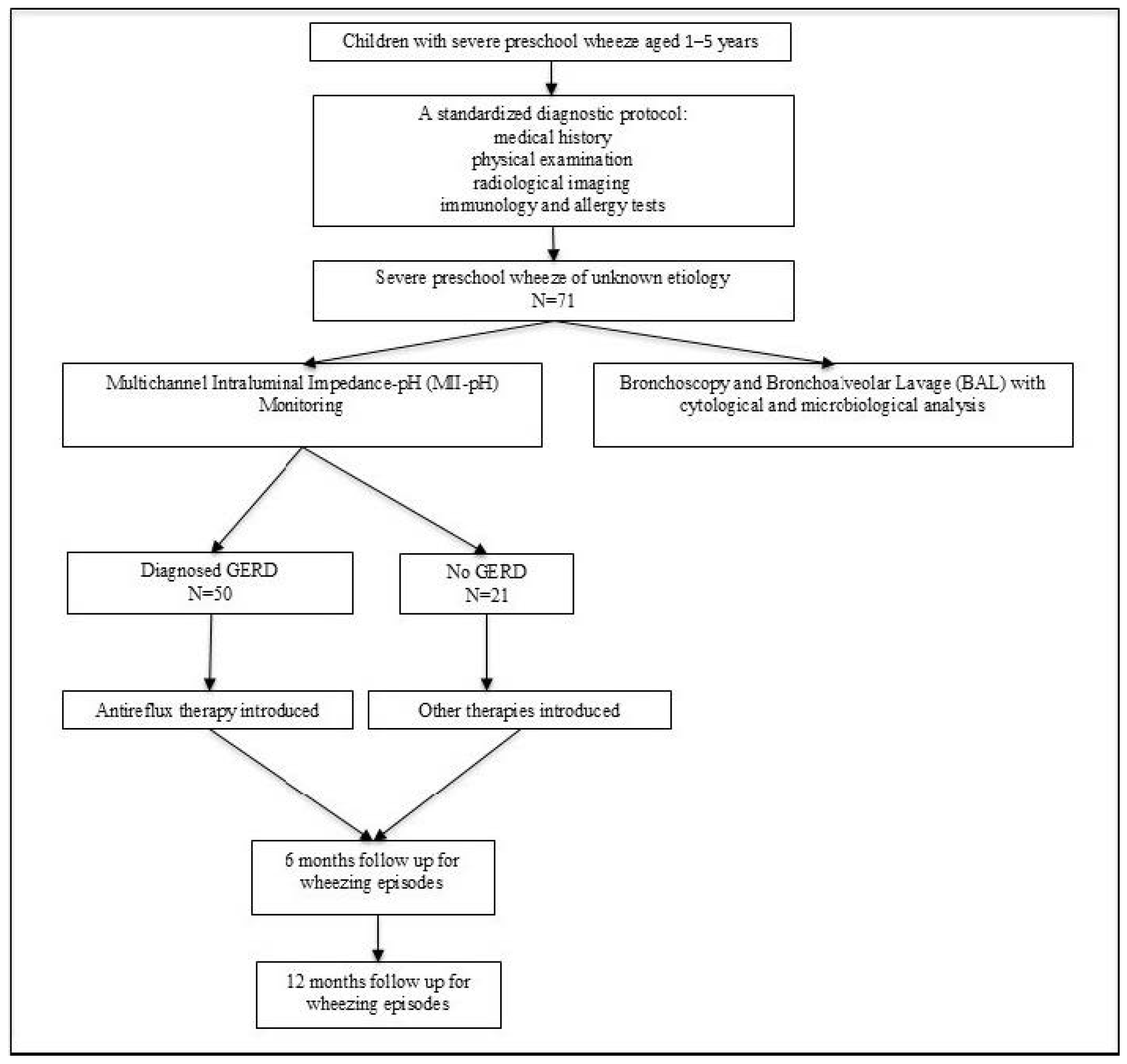 - Pavić, I.; Šarkanji-Golub, R.; Hojsak, I. Diagnostic Utility of pH-MII Monitoring in Preschool Children with Recurrent Wheeze and Suspected Gastroesophageal Reflux Disease: A Prospective Study. Diagnostics 2023, 13, 3567. [Google Scholar] [CrossRef]