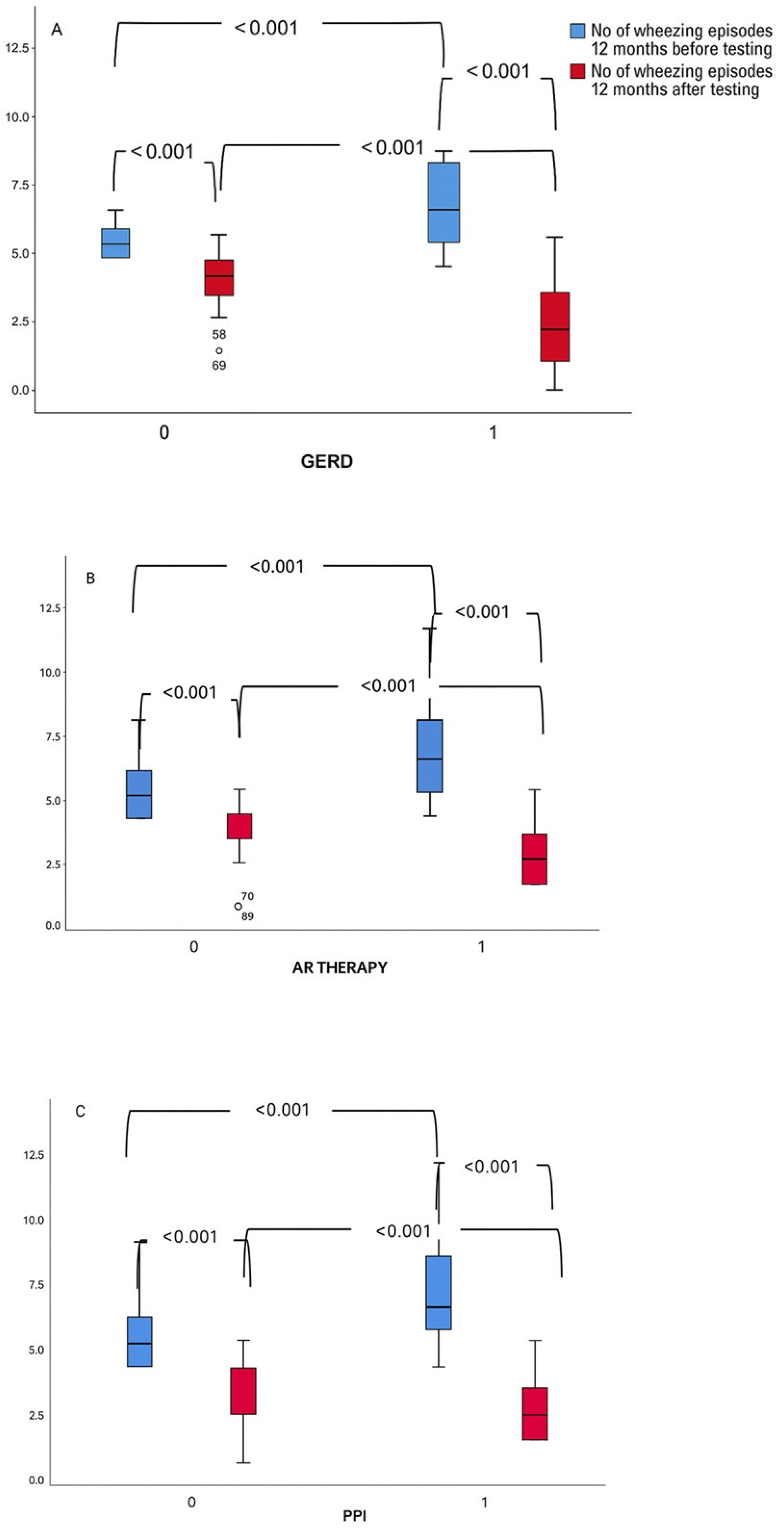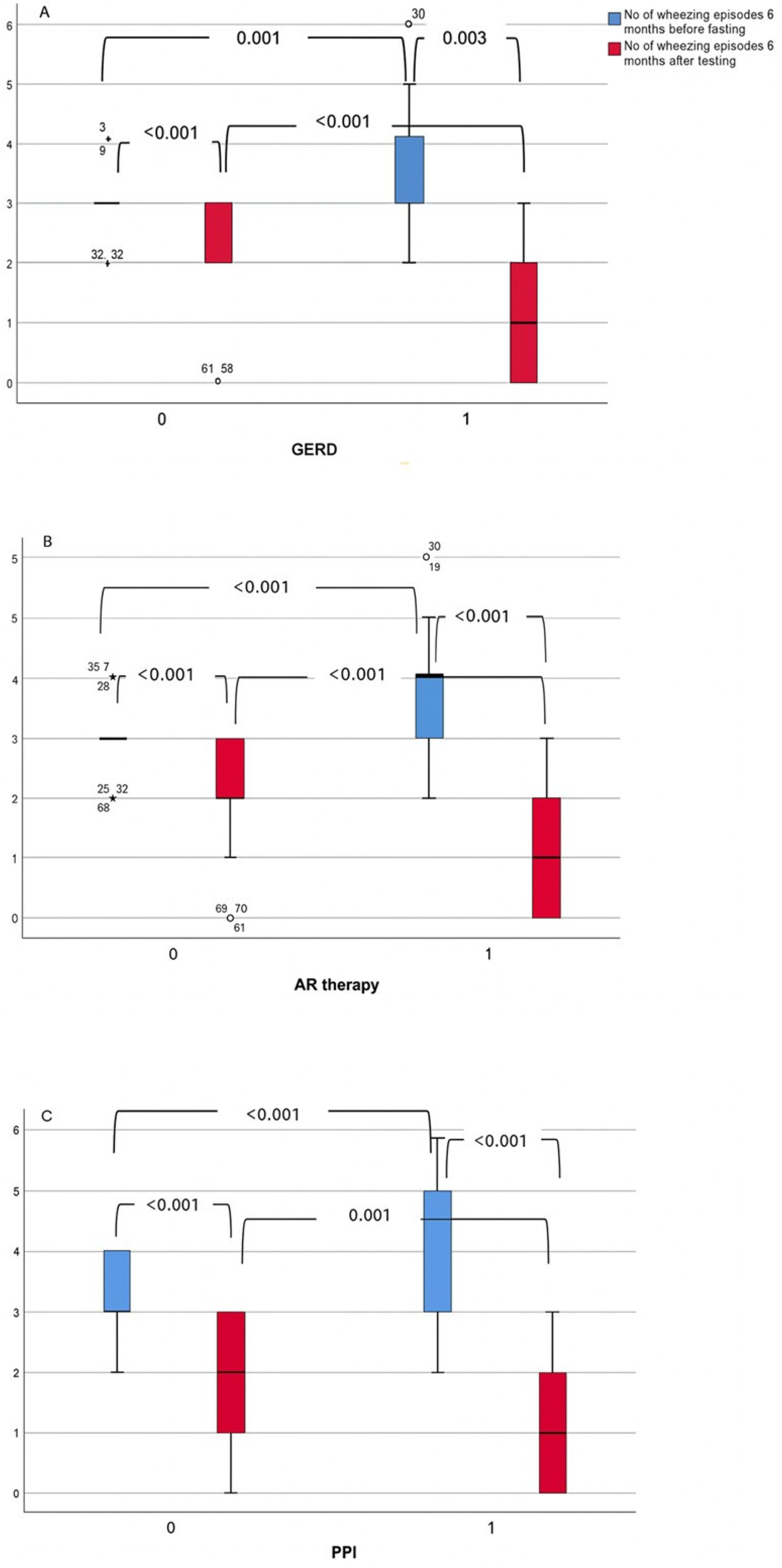 Number of wheezing episodes 6 months before MII-pH, episodes per period (median, range) | 4 (2–6) | 3 (2–4) | <0.001 |