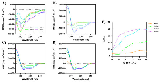 The analysis was performed in varying concentrations of TFE, ranging from 0% to 50% TFE. The addition of TFE promoted α-helical formation for all the analogs, while minimal α-helical change was observed for the native peptide (Figure 1). The formation of α-helix conformation was clearly observed in the buildup of absorption minima at 208 nm and 222 nm, along with the positive signal at 193 nm [34].