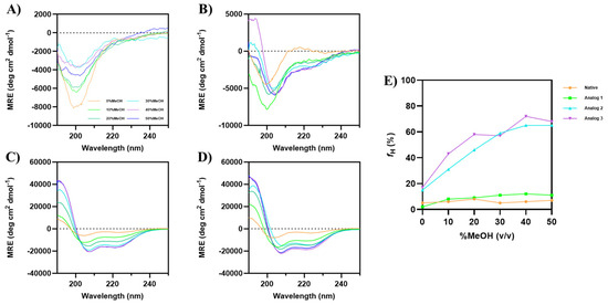 Increasing concentrations of MeOH was also used to induce the formation of α-helical structure of each peptide (Figure 2). Similarly to the previous result with TFE, MeOH did not induce the α-helix signals at 208 and 222 nm in the native peptide, even up to 50% MeOH (Figure 2A); in contrast, Analog-1 showed a small increase in α-helix signals upon increasing MeOH concentrations. Analog-2 (Figure 2C) and -3 (Figure 2D) displayed a well-defined helix even in the absence of methanol, and the addition of MeOH further enhanced the α-helical signals with a plateau at 40–50% MeOH. The helical content (fH) for the native peptide did not change at all different MeOH concentrations (Figure 2E). In contrast, Analog-1 enhanced fH from 2% to 9% in 0 to 20% MeOH, followed by a plateau at fH of 11–12% in 30–50% MeOH. The helical contents Analog-2 and -3 were maximized at fH of 65% and 72%, respectively, in 40–50% MeOH.