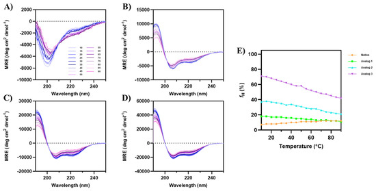 The effect of temperature from 10 °C to 90 °C on the CD spectra of (A) native peptide, (B) Analog-1, (C) Analog-2, and (D) Analog-3 in 20% TFE. (E) The fraction of helical content (fH) plotted against temperature for all peptides. Initially at 10 °C, the native peptide has very low α-helical signal; however, the helical signals at 208 and 222 nm increased when temperature was increased to 90 °C. All three analogs maintained consistent α-helical features, with negative peaks at 208 nm and 222 nm, and a positive peak at 193 nm, across all temperatures. The depth of the signals at 208 nm and 222 nm for all analogs were decreased as the temperature increased to 90 °C.