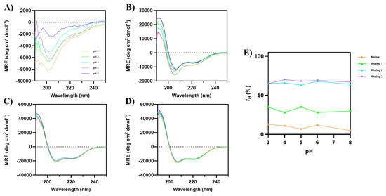 The helical stability of all peptides was examined as a function of pHs (3–8) in 20% TFE (Figure 4). Although the parent native peptide did not have a helical structure, pH changes showed a dramatic decrease in the minima intensity at 200 nm (Figure 4A), with minimal changes in the α-helical signals at 208 and 222 nm. Analog-1 showed a slight change in the CD spectra as the pH increased, with some signal fluctuations at pH 3 and 5 (Figure 4B). In contrast, the CD spectra of Analog-2 and -3 did not show any change throughout all pHs (Figure 4C,D), indicating that the α-helical structure was stable at various pHs. Analog-1, fH values fluctuated between 28 and 35% at all pHs (Figure 4E). The native peptide has an fH value of 13% at pH 3, with lower fH at pH 5 (7%) and 8 (5%). In contrast, both Analog-2 and -3 have a stable helical structure in all pHs (Figure 4E). Overall, substituting specific amino acids in the native peptide with helix-promoting residues resulted in a high α-helical content with good stability at different temperatures and pH values.