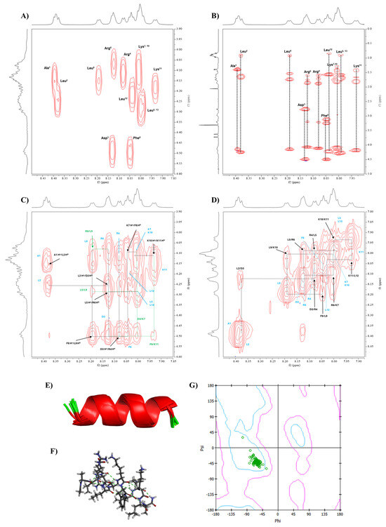 The conformational study of Analog-2 using NMR and molecular dynamic (MD) simulations. The NMR spectra of Analog-2 were performed in 20% MeOD at 298.15 K using a Bruker AVIII 600 MHz spectrometer. (A) COSY and (B) TOCSY spectra were used to assign all protons in Analog-2. The through-space proton–proton interactions were determined using NOESY spectra using (C) Hα(i)-NH(i+1) and (D) NH(i)-NH(i+1) interactions. The NMR-restrained MD simulations generated α-helical structure, as represented by (E) ribbon and (F) stick structures. (G) The Ramachandran plot was constructed to show the Phi-Psi dihedral angles of Analog-2 that are located in the α-helical region.
