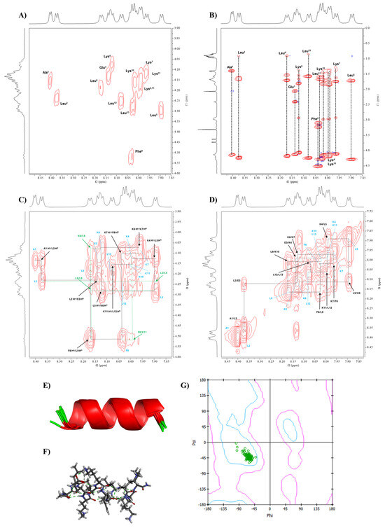 The NOESY spectra confirmed the sequential connectivity of amino acids within the peptide to complement proton identification for the COSY and TOCSY spectra [17]. The NOESY spectra identified the correlations between Hα(i)-NH(i+1), allowing us to confirm the amino acid sequence in Analog-2 (Figure 5C). In this case, seven cross-peaks were observed for Analog-2 to indicate correlations between Hα(A1)-NH(L2), Hα(L2)-NH(D3), Hα(D3)-NH(R4), Hα(L5)-NH(R6), Hα(K7)-NH(F8), Hα(F8)-NH(L9), and Hα(K10)-NH(K11) (Figure 5C). The NH(i)-NH(i+1) correlations were also assigned to nine cross-peaks, including NH(L2)-NH(D3), NH(D3)-NH(R4), NH(R4)-NH(L5), NH(L5)-NH(R6), NH(R6)-NH(K7), NH(F8)-NH(L9), NH(L9)-NH(K10), NH(K10)-NH(K11), and NH(K11)-NH(L12) (Figure 5D). This result confirmed the presence of a continuous α-helix backbone structure in Analog-2. Medium through-space interactions were also identified, such as NH(L2)-NH(R4), NH(R6)-NH(F8), and NH(L9)-NH(K11). Several additional long-range interactions were also identified between Hα(i)-NH(i+3), Hα(i)-NH(i+4), and Hα(i)-Hβ(i+3).