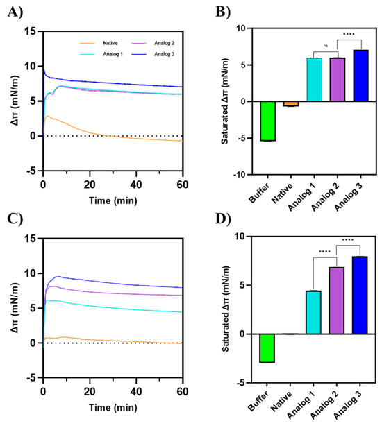 The change in the surface pressure (Δπ) of membranes by peptides on (A,B) a Gram-positive membrane model consisting of POPG:POPE with a 7:3 ratio and (C,D) a Gram-negative membrane model consisting of POPG:POPE with a 3:7 ratio. Analog-3 exhibited the highest surface activity on both membrane models. On a Gram-positive membrane model, Analog-2 showed no significant difference in surface activity compared to Analog-1. However, on the Gram-negative membrane model, Analog-2 demonstrated a higher Δπ than Analog-1. These findings indicate that the surface activity of each peptide is influenced by the composition of the membrane. Statistical comparisons between peptide groups were performed using a Mann–Whitney U test, a non-parametric, two-tailed test, with a significance level set at p < 0.05.