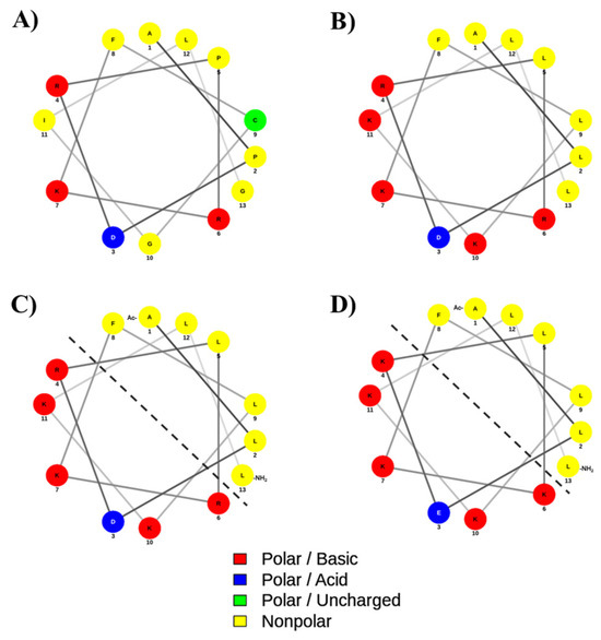 The helical wheel and net projection of (A) native, (B) Analog-1, (C) Analog-2, and (D) Analog-3. The dashed line separates the hydrophobic and hydrophilic surfaces of the amphipathic helix structure. The polar basic residues with a positive charge and polar acidic residues with a negative charge are indicated as red and blue colors, respectively. The non-polar and polar uncharged residues are marked as yellow and green colors, respectively. The helical diagram was generated using NetWheels: Peptides Helical Wheel and Net projections maker (http://www.lbqp.unb.br/NetWheels/, accessed on 7 August 2025).
